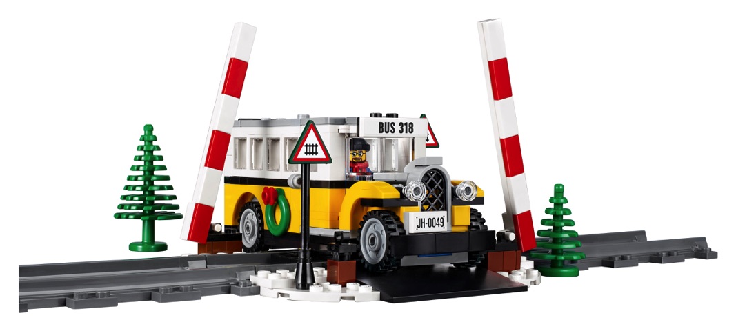 Vous y trouverez bon nombre d’éléments pour donner encore plus de vie à votre village de noël : une gare (en fait un demi-bâtiment, dont l’intérieur est accessible par l’autre côté), quatre rails droits, un passage à niveau avec ses barrières et ses panneaux, un bus ou encore quelques sapins. Cinq minifigs sont également de la partie, avec une mère et un enfant, l’employé de la gare, la barista et évidemment le chauffeur du bus.