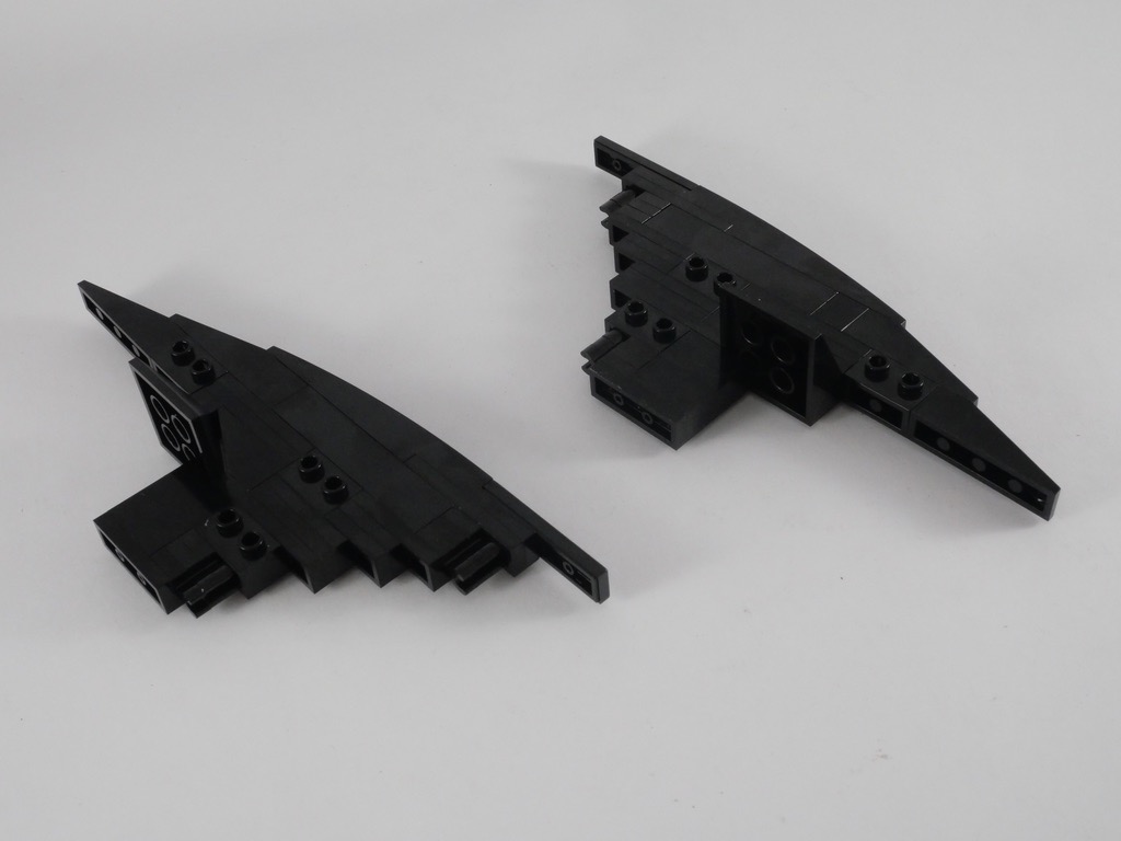 22 – Dans l’étape suivante, nous construisons les deux « ailes » situées à l’arrirèe. Nous commençons par deux sous-ensembles qui viennent se fixer au corps de la Batmobile et constituer la partie supérieure de ces ailes. Deux autres sous-ensembles, clipsés « à l’envers » sur les précédents, en constituent la partie inférieure. On décore les côtés avec quelques tiles.