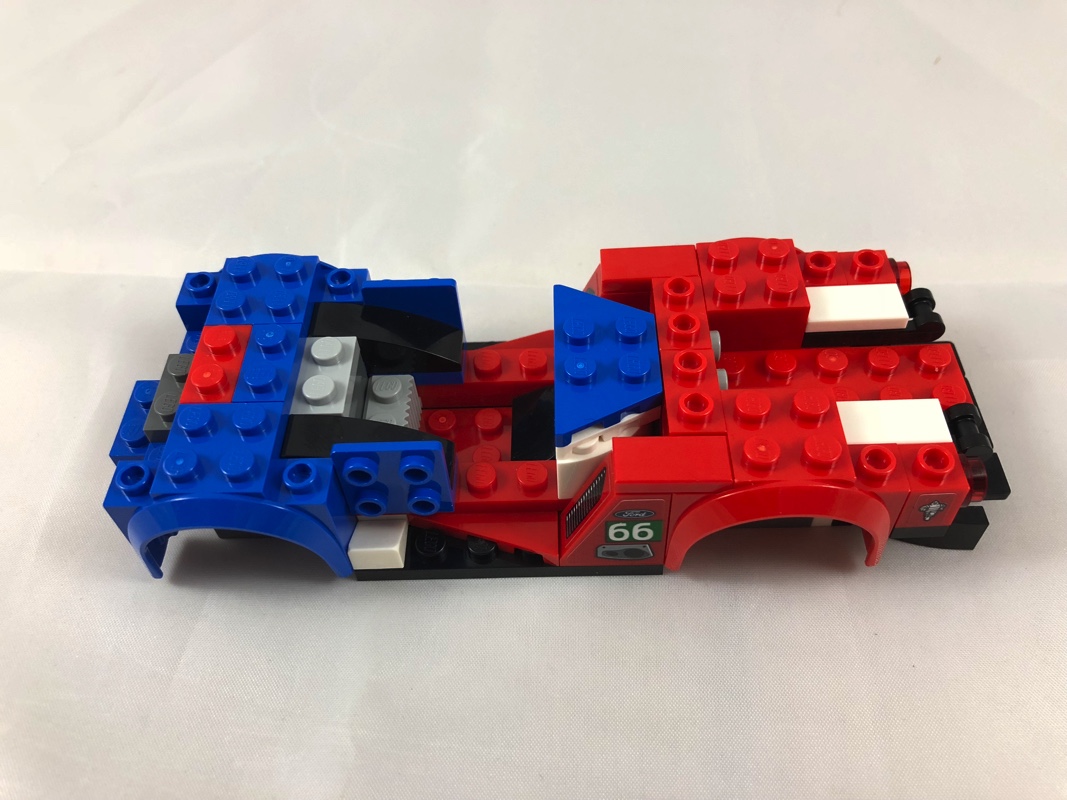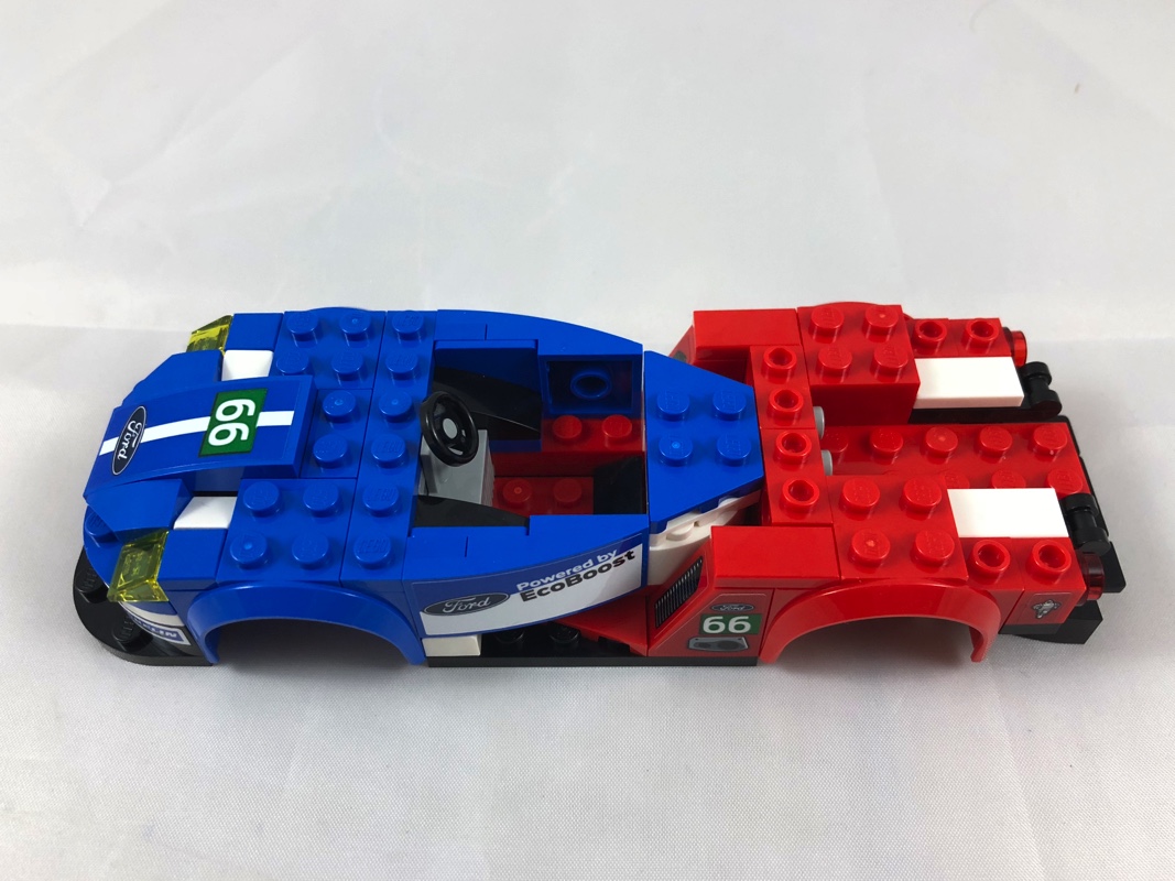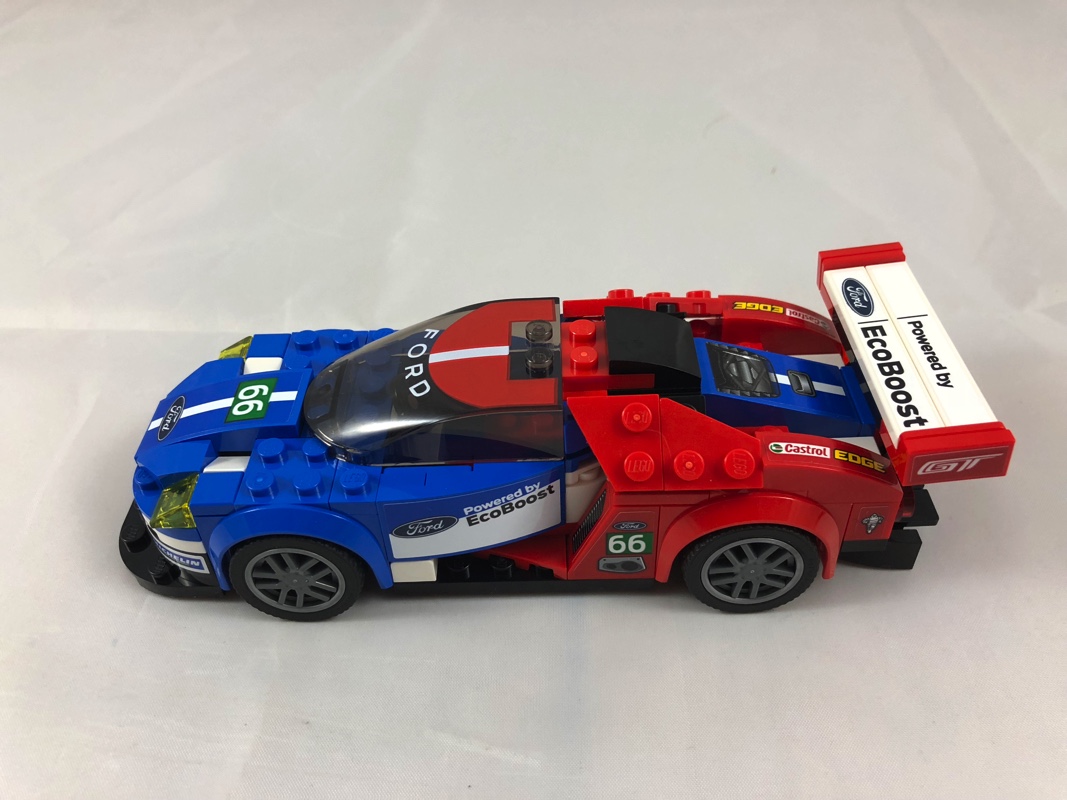 La construction de l’autre voiture, la Ford GT de 2016, est moins intéressante et se limite essentiellement à l’empilement de briques (et de stickers… et ils sont particulièrement nombreux). L’aspect final est néanmoins plutôt réussi, on regrettera cependant ces tenons visibles sur le capot, c’est assez disgracieux. Ce dernier semble également trop plat. Le mélange de couleurs est joli, la transition se faisant en douceur depuis le bleu de l’avant jusqu’au rouge de l’arrière. Enfin, je me répète, le pare-brise tampographié est vraiment magnifique. On apprécie également l’effort, malgré un trop grand nombre de stickers, de réaliser les feux avant et arrière à l’aide de briques.