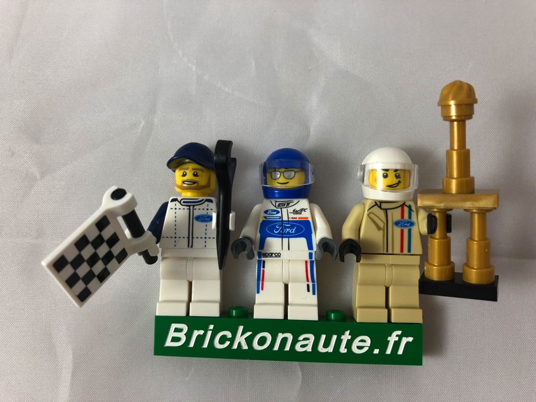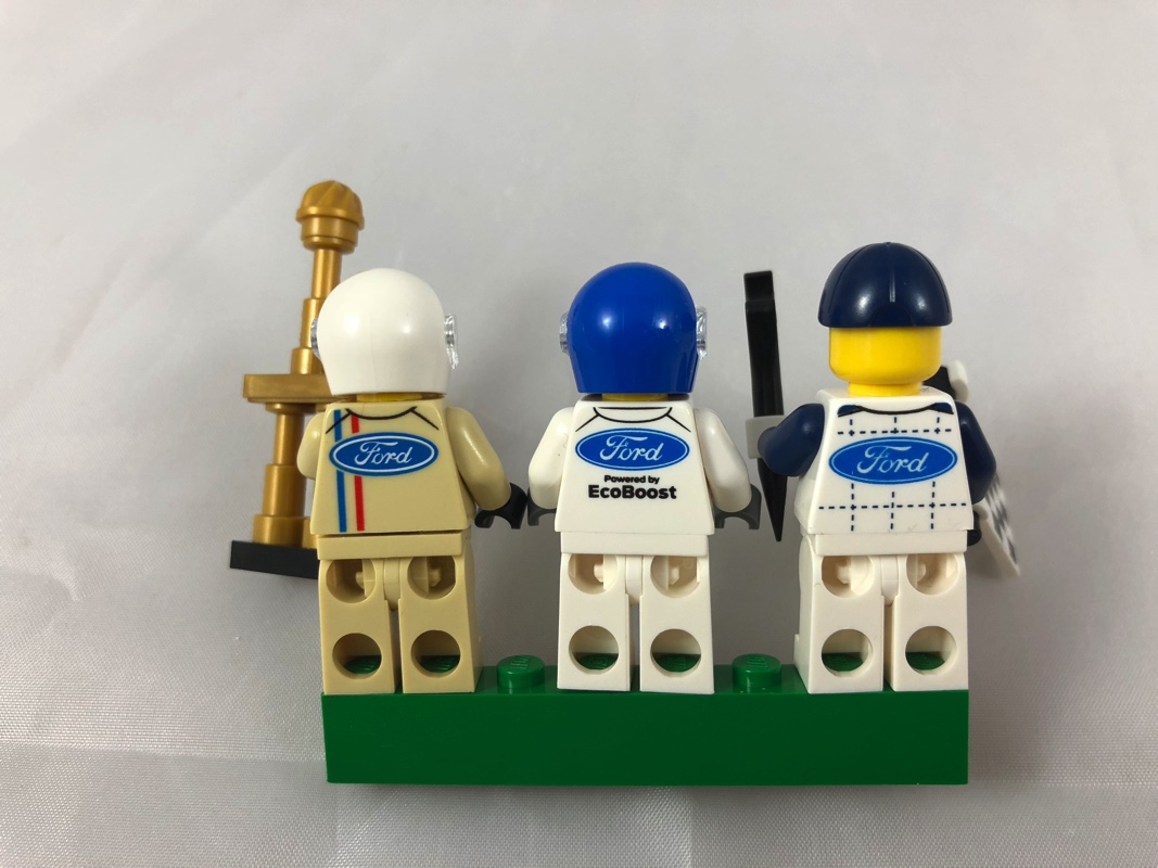 Enfin, nous avons le pilote de la Ford GT40 de 1966. Lui porte un casque blanc et arbore un visage souriant. Les jambes sont monochromes, et le torse vintage couleur tan arbore un petit logo Ford et deux bandes (une rouge et une bleue) sur l’avant, tandis qu’on retrouve ces deux bandes et un logo plus grand sur l’arrière. Il porte un trophée aussi grand que lui, à base de pièces en pearl gold.
