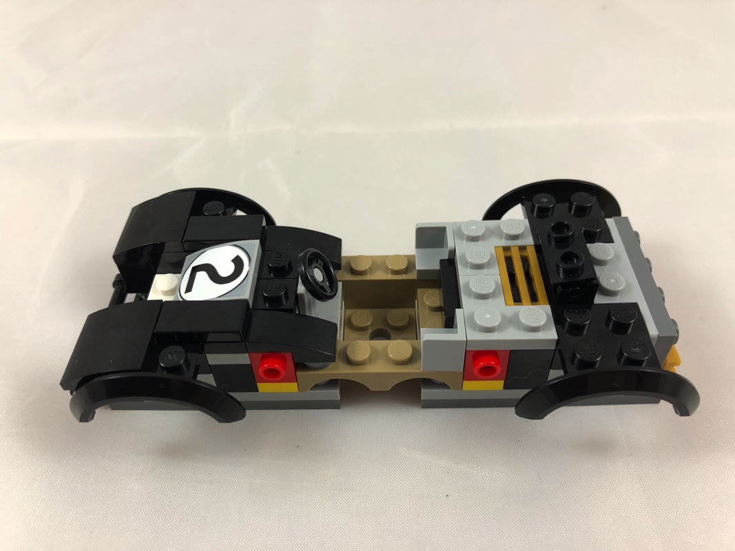 On continue avec l’assemblage de la Ford GT40. Ici, pas de châssis « tout fait », on le reconstitue à l’aide de différents éléments. On habille ensuite l’avant et l’arrière (sans les feux) avant de s’attaquer aux côtés de la voiture. Il faudra vous armer de patience pour appliquer correctement tous les stickers afin d’obtenir un rendu probant. On ajoute ensuite le cockpit, avant de s’attaquer à l’arrière. On ajoute ensuite les roues (et les très belles jantes en pearl gold), avant d’ajouter les phares avant constitué de briques, et dont l’angle est intelligemment trouvé grâce à des clips solidaires du châssis. Belle expérience de construction pour cette première voiture.