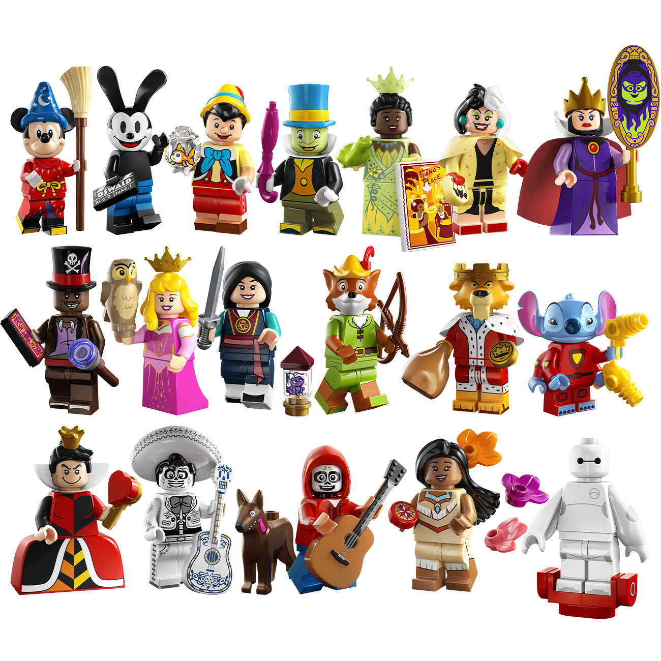 Avec cette nouvelle série de personnages à collectionner, LEGO nous propose un total de 18 personnages inspirés des nombreux dessins animés et films d’animation de la firme aux grandes oreilles – avec, en vrac, Pïnocchio, Jiminy Cricket, Mickey Mouse, la Belle au Bois Dormant, Miguel et Ernesto (Coco), Pocahontas, Cruella, Robin des Bois et le Prince Jean, Oswald, Baymax (Les Nouveaux Héros), Stitch ou encore Mulan.
