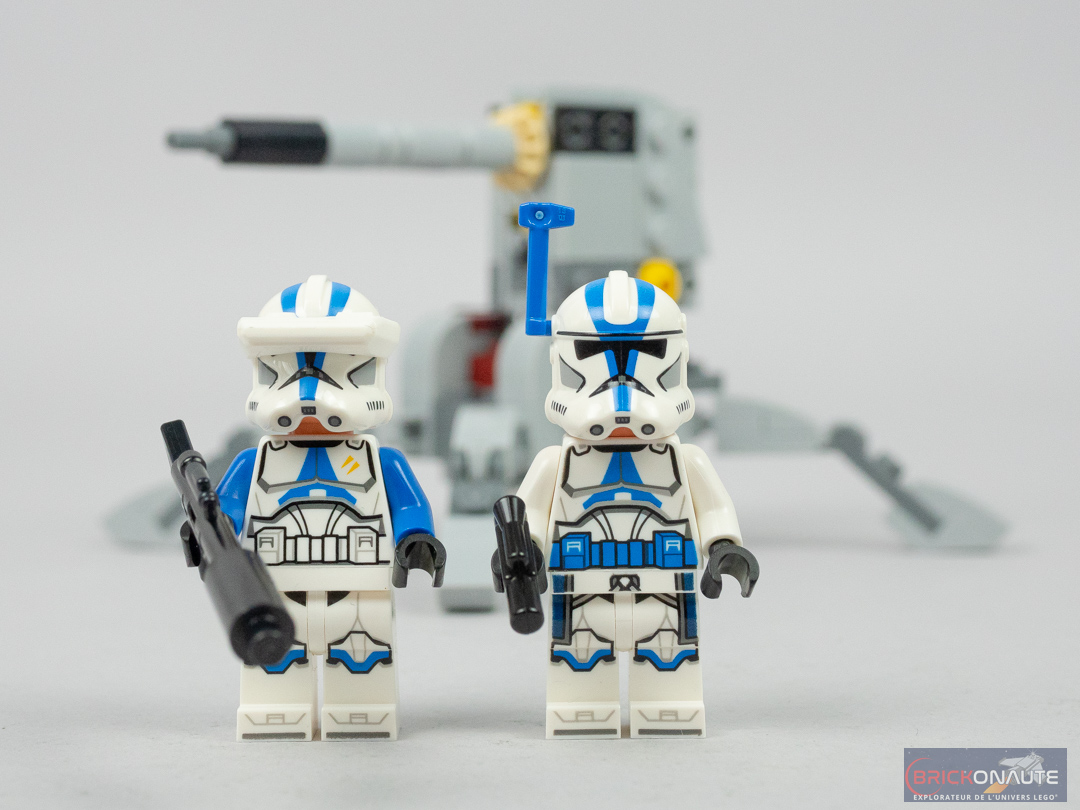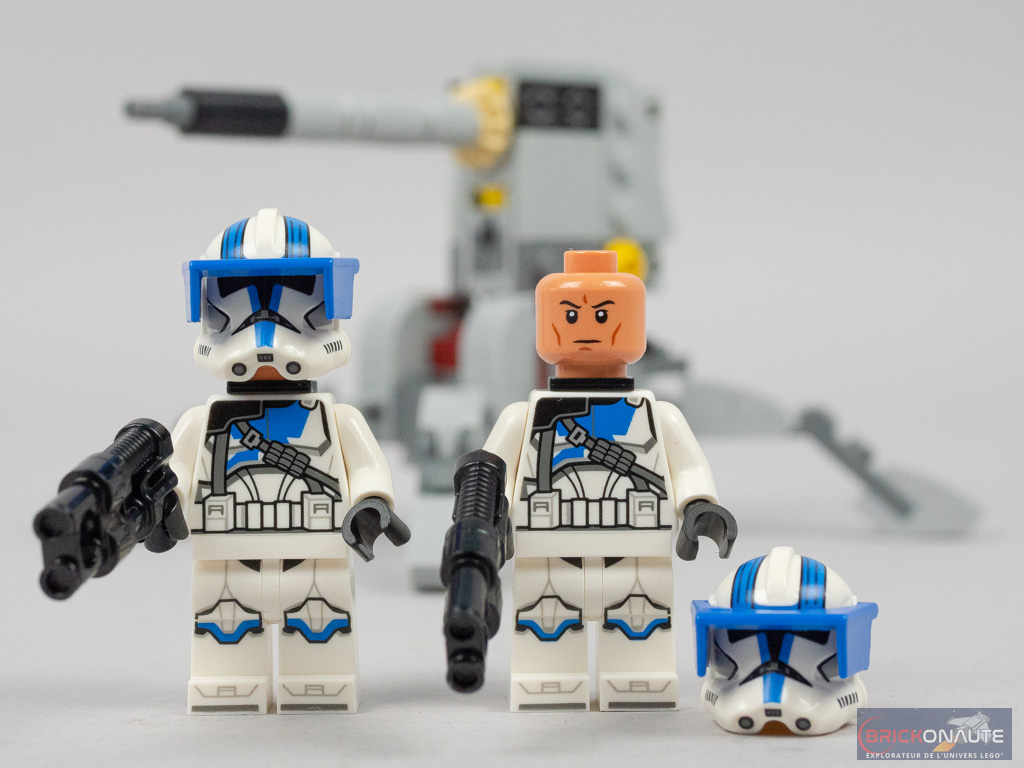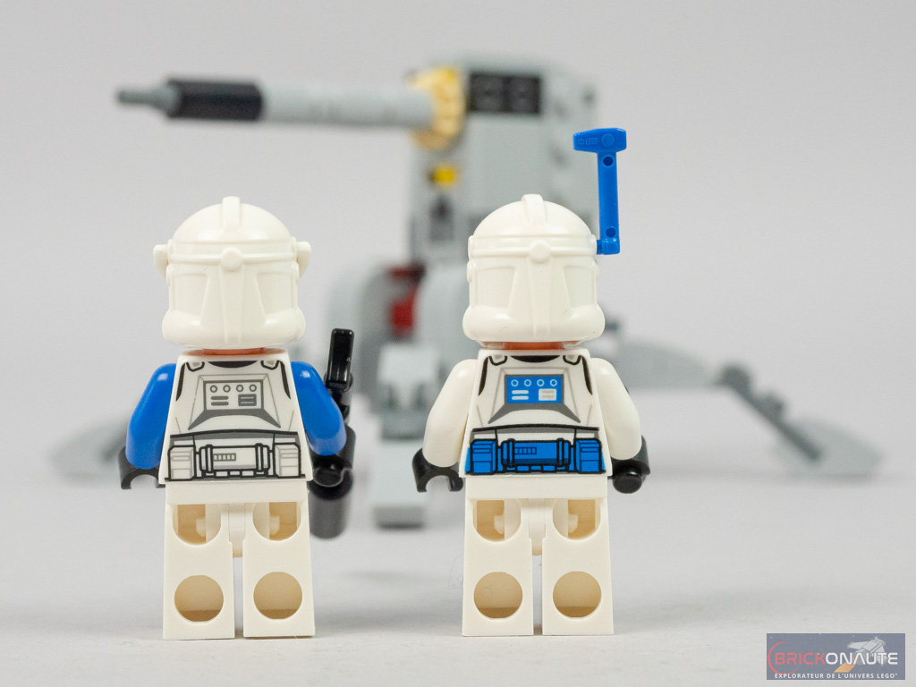 Le 501st Officer est le seul à avoir un pantalon différent des autres, un peu plus travaillé avec notamment une tampographie au niveau de la ceinture et une cape de taille kama. Son torse est également unique avec sa ceinture bleue. Aux accessoires près (un rangefinder contre un dispositif de visée – qui aurait peut-être mérité d’être tampographié), le casque est identique à celui du 501st Clone Specialist avec ses simples bandes bleues. Le torse de ce dernier est également unique, on le reconnaît aux deux petites bande jaunes en guise de galons.