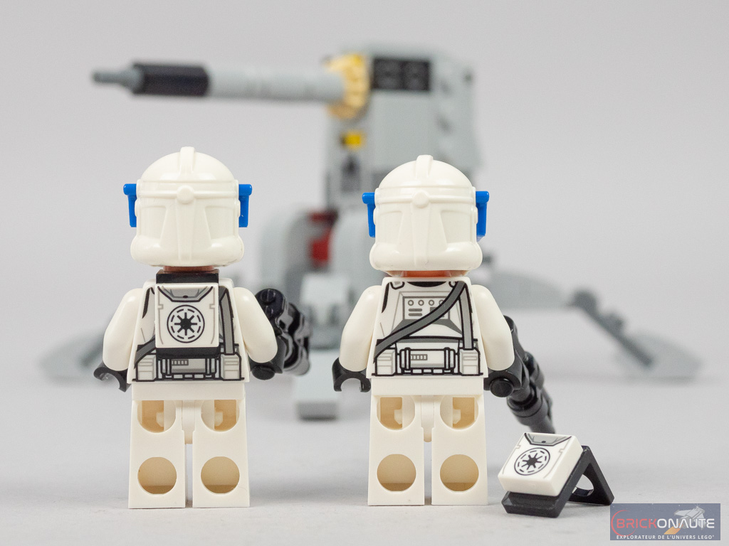 Les deux autres minifigs, des 501st Heavy Troopers, sont identiques et partagent le même pantalon que le Clone Specialist. Leur torse est très bien réalisé avec une ceinture blanche et des poches à munitions. Un petit backpack dans le dos arbore le logo de la République Galactique. Leur casque est également différent des deux précédents – vous remarquerez les petits traits noirs au niveau des bandes bleues. Ils sont équipés d’une visière. J’ai profité de la première photo ci-dessous pour enlever le casque – comme vous vous en doutez, tous les 4 sont identiques.