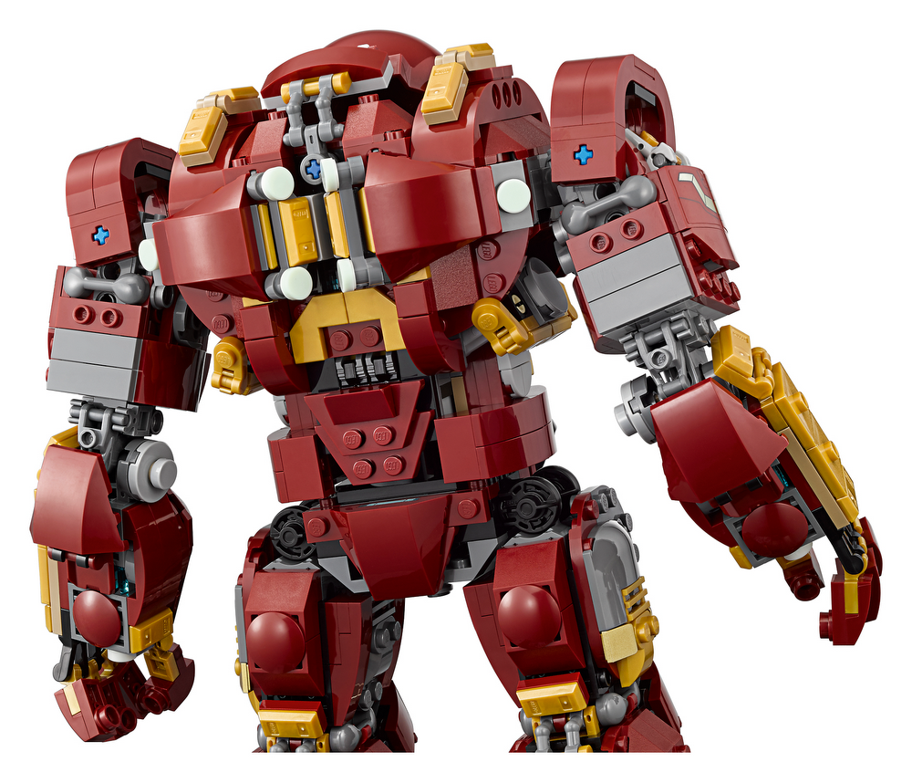 - Le Hulkbuster est équipé d’une tête qui se renverse, d’un torse rotatif, de doigts, de bras, de jambes et de pieds articulés, d’une brique LEGO® lumineuse sur la poitrine, de deux bras gauches interchangeables (un bras normal et un bras marteau-piqueur avec fonction coup de poing) et de 12 éléments phosphorescents.