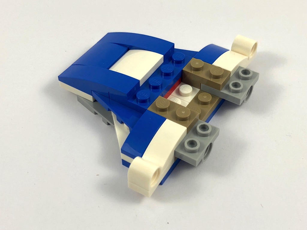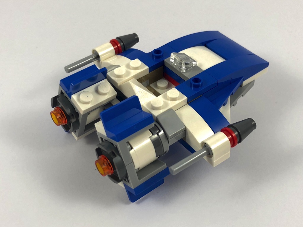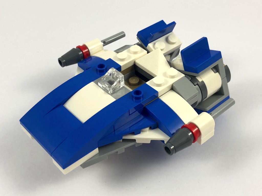 En termes de design, tout d’abord. Le A-Wing est vraiment bien reproduit à l’échelle imposée, et le mélange de couleur choisi est avisé. Pour ne rien gâcher, on notera même une technique de construction intéressante pour ses réacteurs.