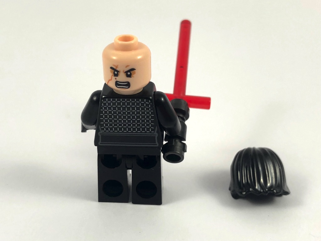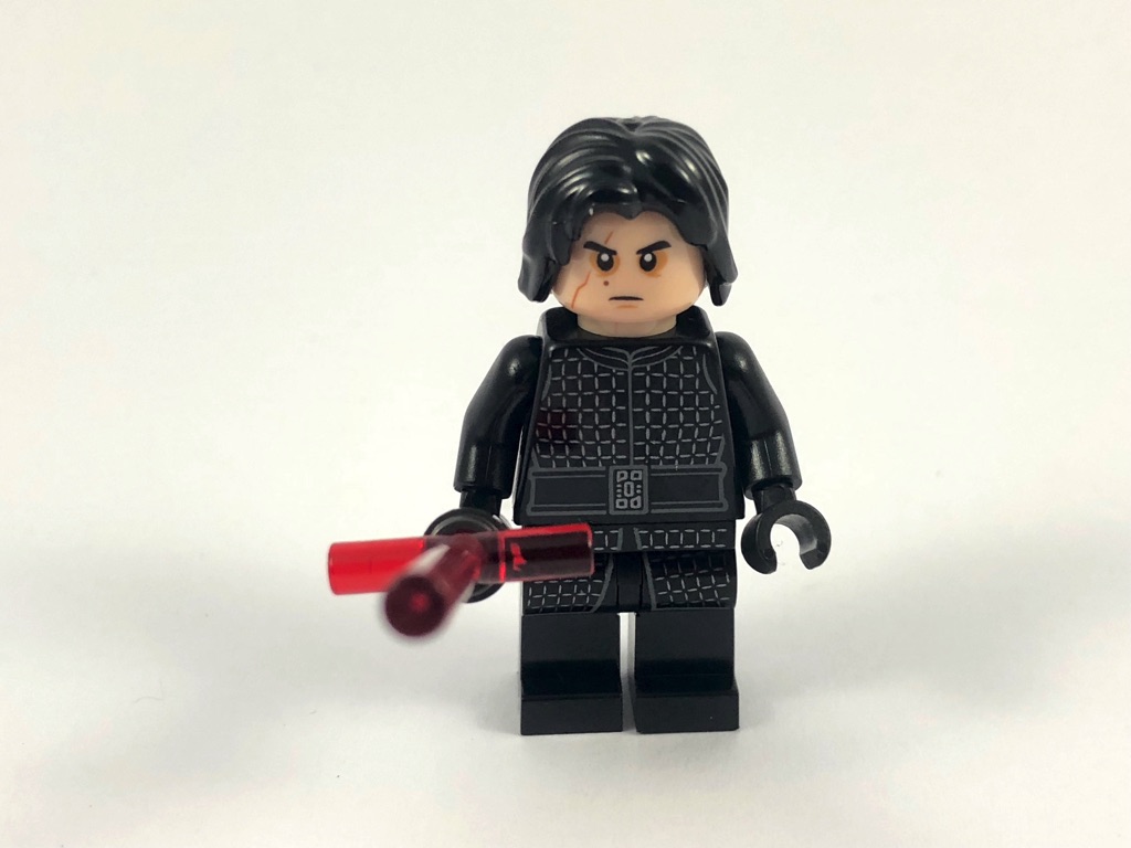 Il s’agit de la même minifig que celle que l’on peut trouver dans le set 75179 – Kylo Ren’s TIE Fighter (dont je vous invite à retrouver la review ici), à ceci près que celui qui nous intéresse aujourd’hui n’a pas de cape. Et c’est très appréciable de pouvoir trouver un personnage comme Kylo Ren dans une boîte proposée à un tarif raisonnable ! Il s’agit donc de Ben Solo tel qu’on le voit dans le dernier volet de la saga, Les Derniers Jedi. En effet, il porte une belle cicatrice au visage. Deux expressions pour celui-ci, l’un sérieux, et l’autre plus furieux. Son vêtement noir est finement tampographié sur le torse, la ceinture et les cuisses. Il est livré avec son sabre laser caractéristique en forme de T. Deuxième bon point pour cette petite boîte que cette seconde minifig.