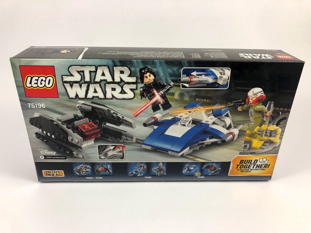 La boîte est d’un format identique à sa comparse du set 75195, soit nettement plus du double de la taille de celles des Microfighters « simples ». Les deux vaisseaux sont aux prises l’un de l’autre et on devine quelques explosions en arrière plan. Les deux (très belles) minifigs sont présentées dans le coin inférieur droit. Derrière, on retrouve les deux protagonistes au sol en train d’en découdre dans ce qui ressemble à un hangar, la pilote de A-Wing tirant avec son blaster et Kylo Ren se défendant avec son sabre laser.