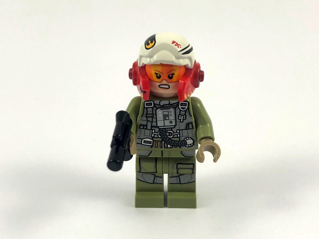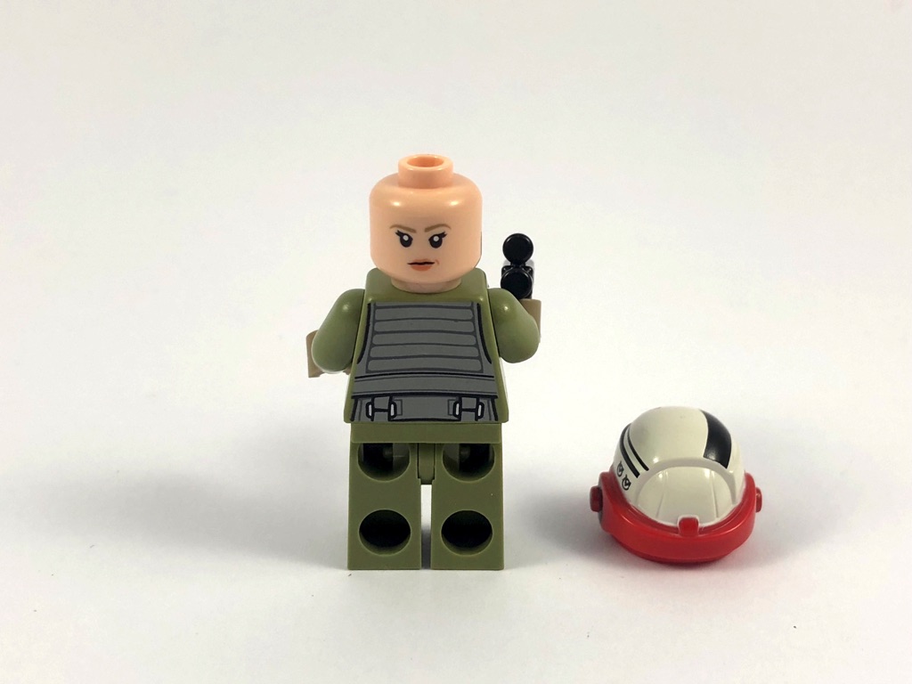 Ce n’est pas une pilote lambda, puisqu’on retrouve Talissan Lintra, pilote de A-Wing dans The Last Jedi. Elle porte une combinaison de pilote couleur olive green, superbement détaillée y compris au niveau de la ceinture. On y trouve de nombreuses poches, boucles, sangles, sans oublier le tuyau qui lui permet de respirer. Nous avons également droit à deux expressions du visage, l’une combattante et déterminée avec la visière du casque et l’autre plus « sage ». Le casque est un petit bijou, intégrant de superbes tampographies colorées et très détaillées. Et pour ne rien gâcher, toutes les pièces qui composent cette minifig sont pour le moment exclusives ! En bref, une superbe réussite que cette pilote.