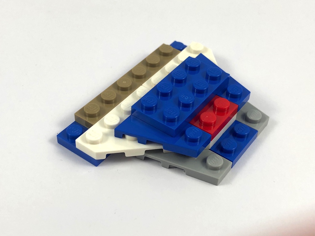 On s’attelle ensuite au vaisseau proprement dit. Le « coeur » du vaisseau se compose d’une base trapézoïdale obtenue grâce à quelques wedges superposés. On ajoute ensuite la partie avant composée de quelques slopes pour retrouver les formes courbes de l’engin, avant d’ajouter sur le côté du poste de pilotage les Plate, Modified 1 x 2 with Pin Hole on Top destinées à recevoir les flick fire missiles.