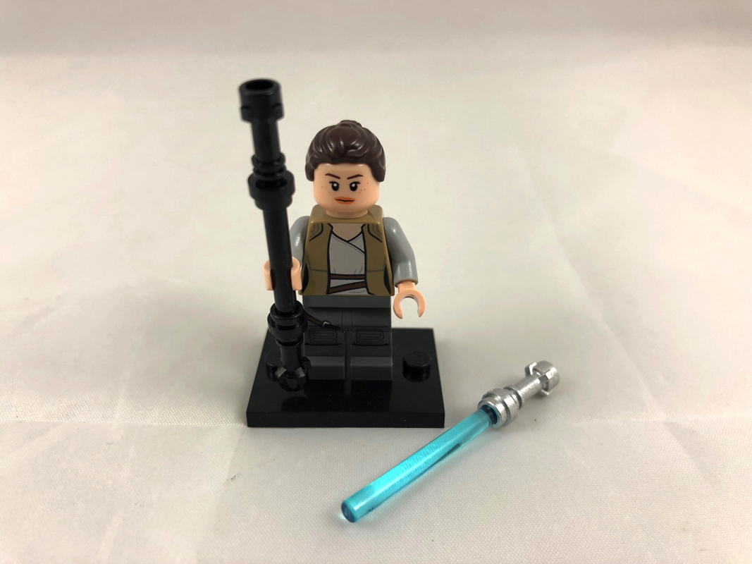 Elle porte une veste marron sur un haut blanc, tel qu’on la voit habillée à la fin du Réveil de la Force. C’est d’ailleurs le seul set à présenter Rey dans cette tenue. Là encore, c’est soigné, malgré plus de simplicité que ce qu’on peut observer sur Luke Skywalker. La coiffure et le visage sont en revanche ceux que nous avons désormais l’habitude de retrouver pour représenter Rey. Ils sont bien réalisés, mais on aurait peut-être aimé trouver un peu plus de nouveauté de ce côté. Elle dispose d’un sabre laser en trans light blue et d’un bâton en guise d’armes.