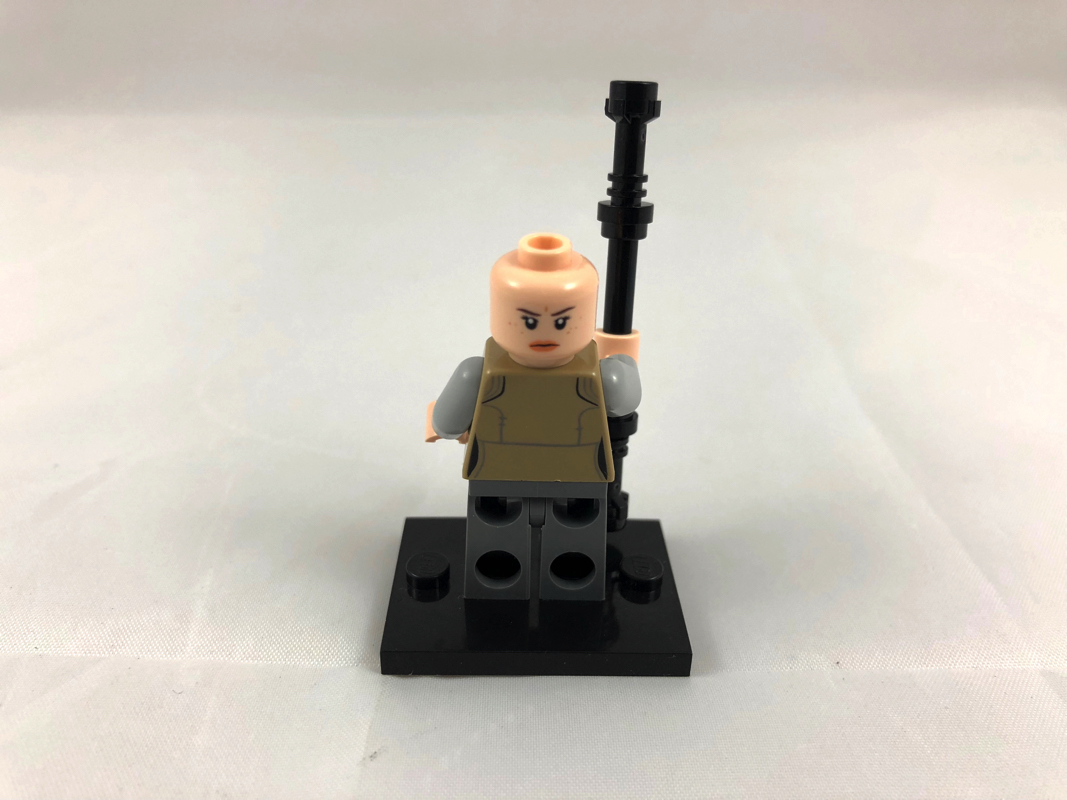 Elle porte une veste marron sur un haut blanc, tel qu’on la voit habillée à la fin du Réveil de la Force. C’est d’ailleurs le seul set à présenter Rey dans cette tenue. Là encore, c’est soigné, malgré plus de simplicité que ce qu’on peut observer sur Luke Skywalker. La coiffure et le visage sont en revanche ceux que nous avons désormais l’habitude de retrouver pour représenter Rey. Ils sont bien réalisés, mais on aurait peut-être aimé trouver un peu plus de nouveauté de ce côté. Elle dispose d’un sabre laser en trans light blue et d’un bâton en guise d’armes.