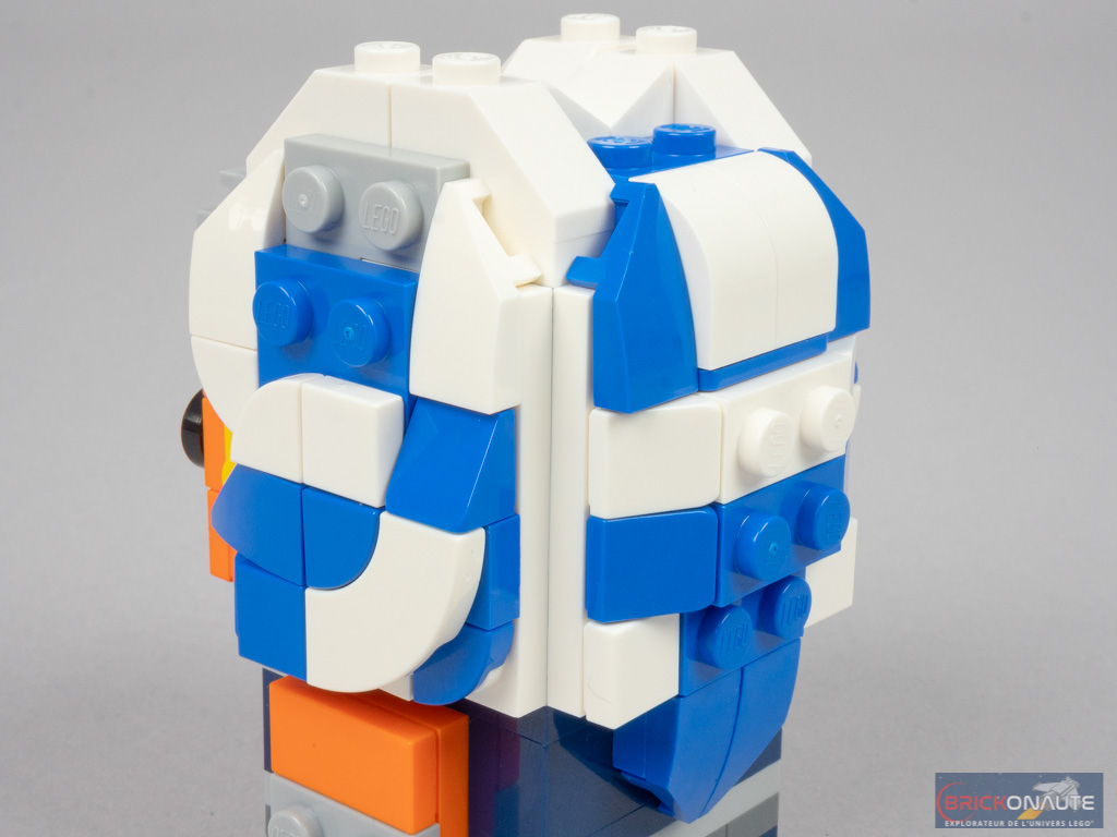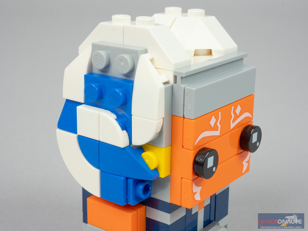 Quand on compare notre personnage à l’original, je trouve que le designer s’en tire plutôt bien : on retrouve plein de petits détails comme les jolies tampographies du visage, les petites plates jaunes près des oreilles, et même la petite échancrure au niveau du cou, laissant apparaître la peau orange. Le dos d’Ahsoka Tano n’est pas oublié, et bénéficie également d’un joli travail. Une petite remarque malgré tout : je pense qu’il aurait été pertinent d’utiliser une autre couleur au niveau du front et des bras – peut-être qu’un sand blue aurait été mieux adapté.