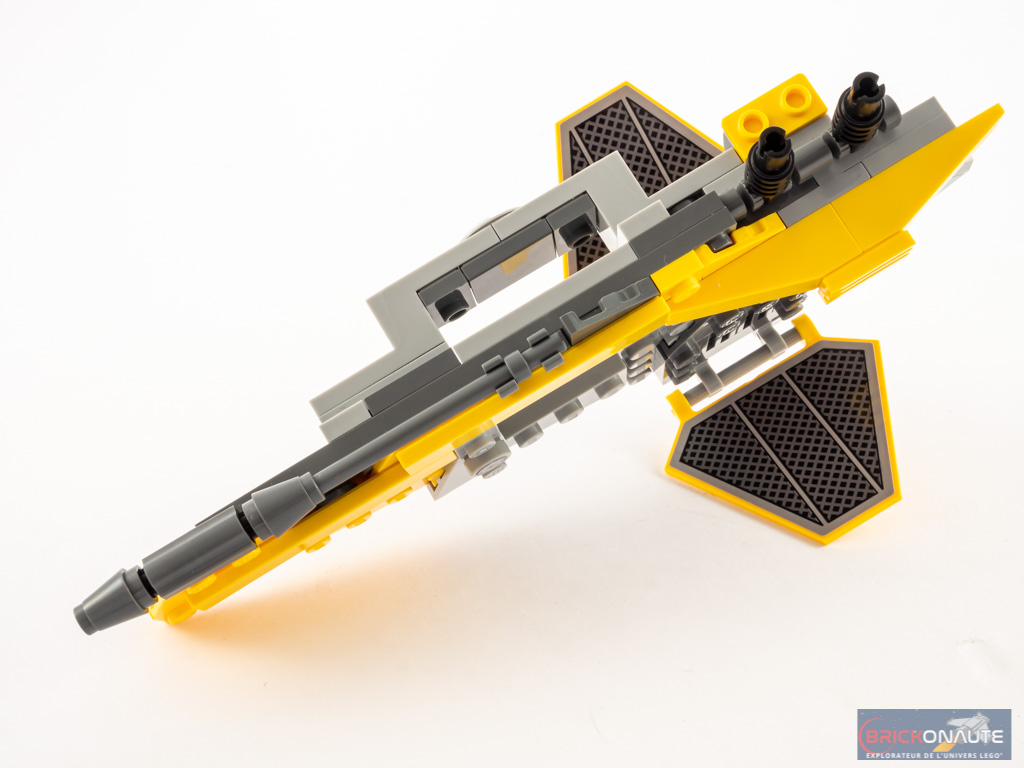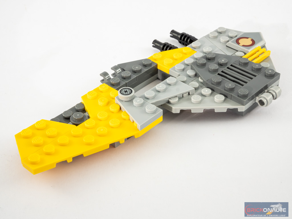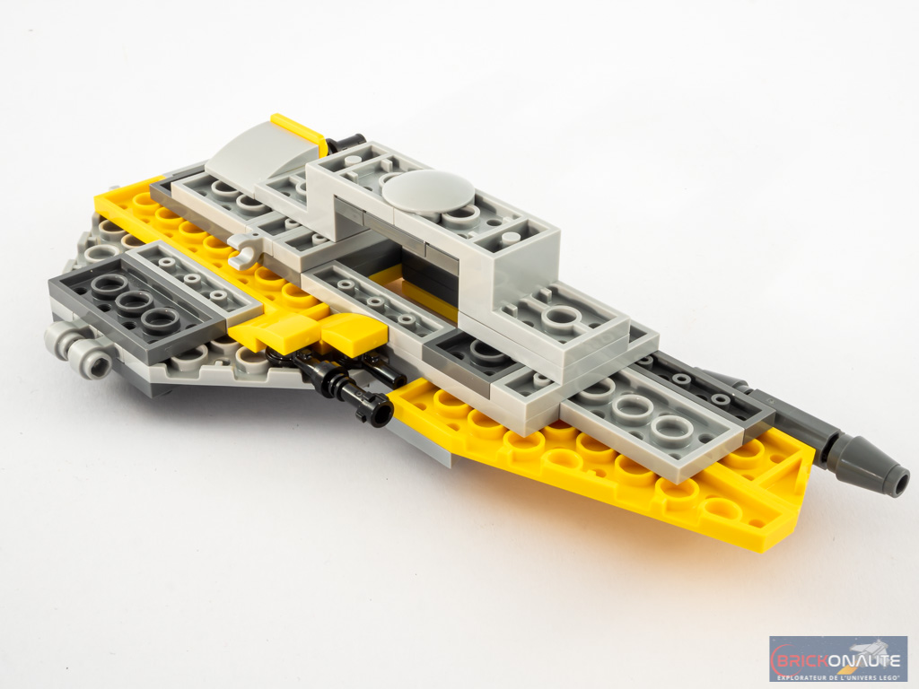 Je ne possède pas les versions précédentes de ce vaisseau et j’avoue avoir été agréablement surpris par ce petit set. Malgré un inventaire « réduit » de 248 pièces, la représentation qui nous est proposée du vaisseau piloté par Anakin Skywalker est convaincante, tant dans les formes que dans les proportions. Et cette couleur jaune a l’avantage d’apporter un peu de « peps » dans une gamme qui se cantonne très souvent aux deux nuances de gris. Il y en a ici, mais il n’est pas prépondérant.