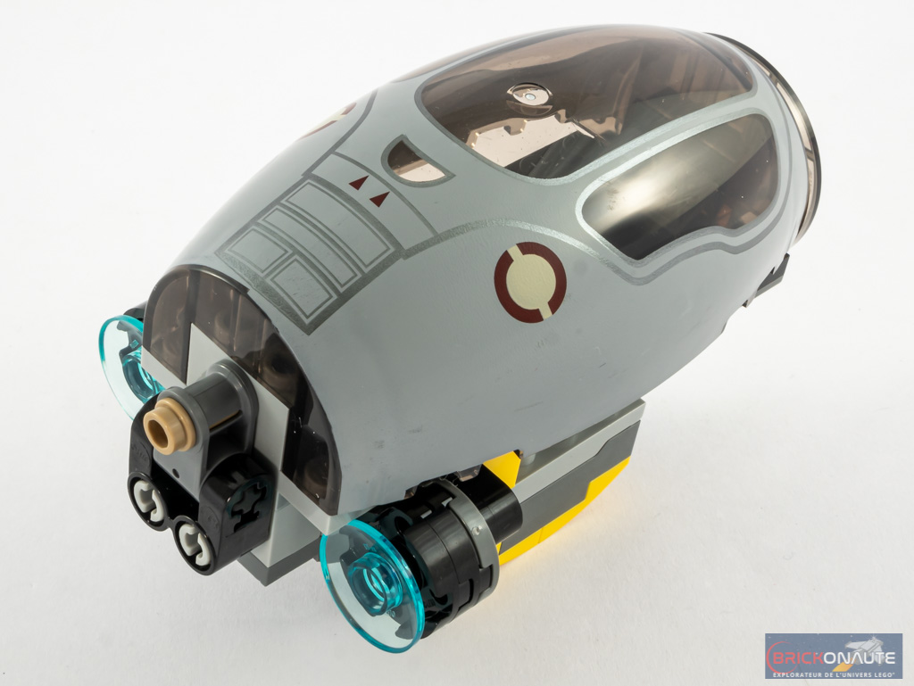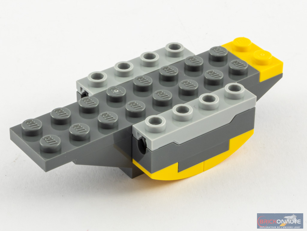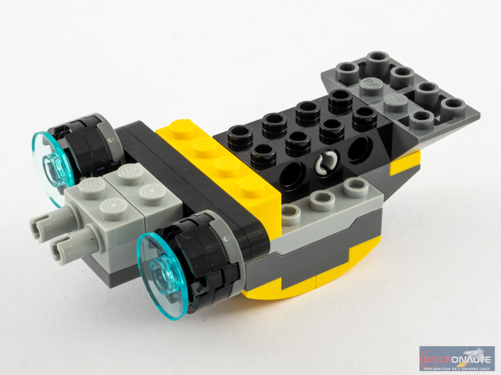 La construction s’étale au travers de 3 grandes étapes : le cockpit, et chacune des deux ailes. La construction du cockpit commence par la base de celui-ci, sous laquelle on vient dissimuler deux spring shooters. Les réacteurs sont représentés de manière simple et efficace par des dishs bleus translucides. L’intérieur du cockpit est assez sommaire : une petite slope avec un autocollant pour le tableau de commande, et un dossier de siège marron dans lequel le pilote adopte une position semi-allongée. On fixe la verrière sur un axe Technic à l’arrière du cockpit.