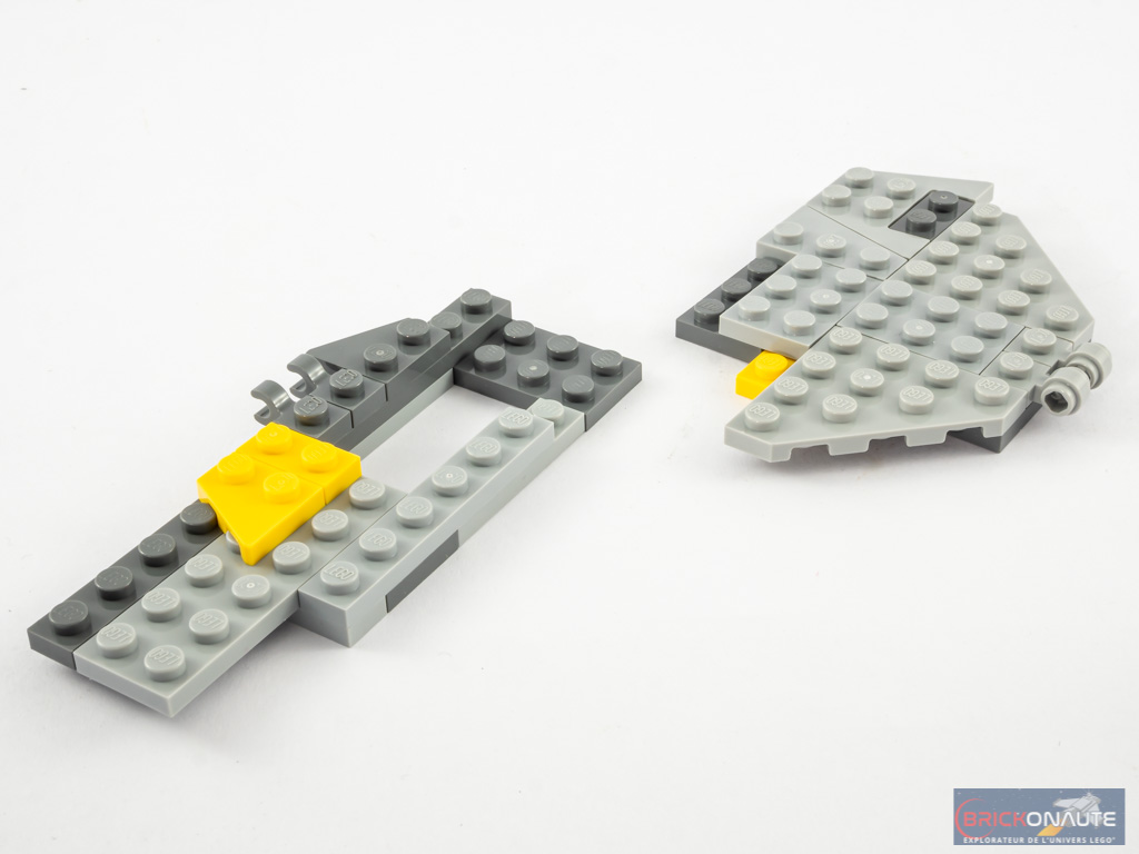 La construction de l’aile droite est identique à la précédente, à la symétrie et quelques détails près comme l’emplacement pour le droïde, ici inexistant et couvert d’une tile. Les deux ailes sont fixées au cockpit par des pins enfichés dans la structure, puis orientées grâce à des charnières à cliquets.