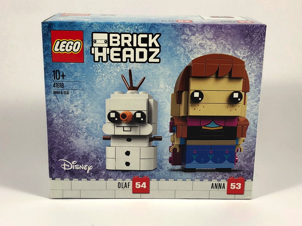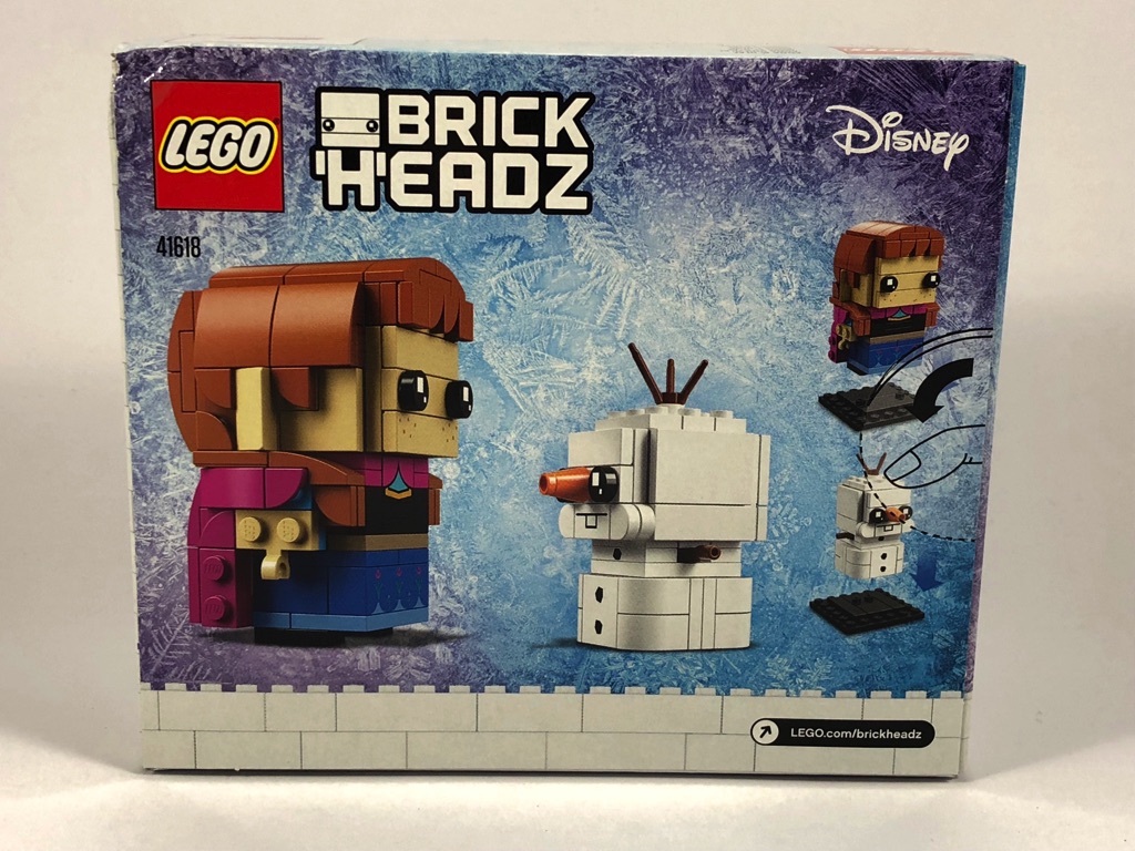 C’est pour moi la première boîte de ce « format », avec une BrickHeadz standard et une plus petite de 3x3x3 tenons. Le format de celle-ci se situe entre celui des BrickHeadz à l’unité, et celles vendues en « couple ». Le code couleur retenu est le même que pour la boîte 41617 – Elsa, à savoir un fond gelé sur lequel sont présentés nos deux personnages. Leurs numéros respectifs sont 53 pour Anna, et 54 pour Olaf. À l’arrière de la boîte, elles sont représentées se faisant face, et en plus petit sur leurs socles respectifs.