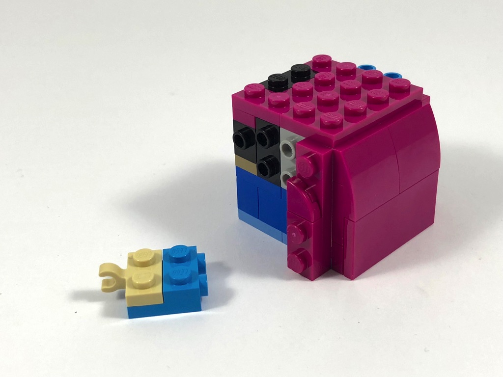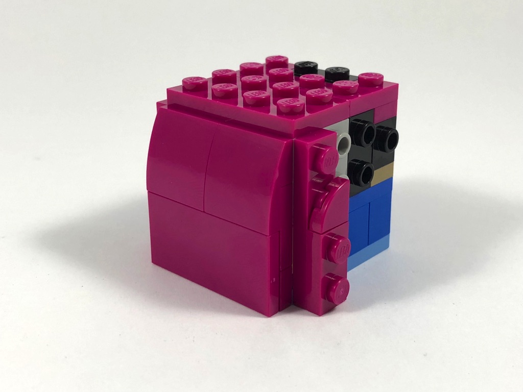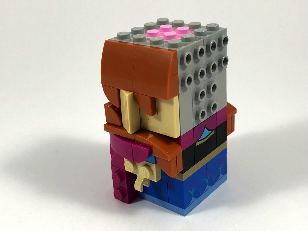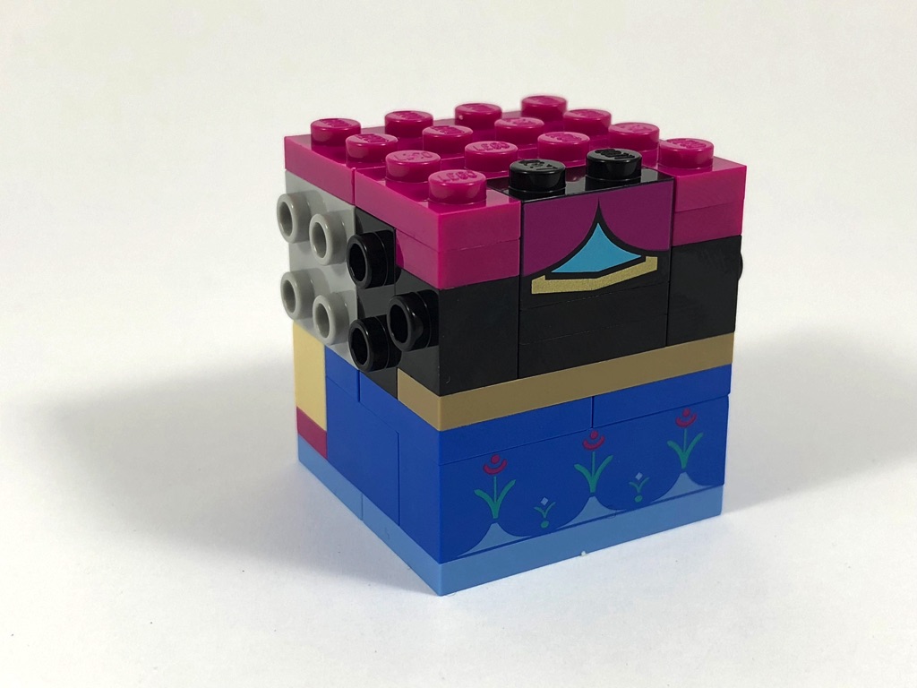 Tout comme pour sa soeur, la construction d’Anna ne commence pas par le buste, comme habituellement chez les BrickHeadz, mais par la robe. Elle est cependant nettement plus simple : aucun pli n’est représenté dans sa partie basse. Il s’agit donc bêtement d’une « tour » de 4×4 tenons, sur laquelle on vient construire la cape couleur magenta grâce à des briques SNOT laissées sur la partie arrière.