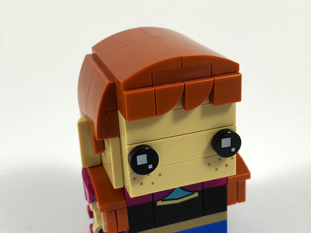 En revanche, Anna apporte son lot de fraîcheur chez les BrickHeadz, à l’instar de sa soeur Elsa. Ne serait-ce que dans l’ordre de construction, où l’ensemble de la robe est assemblé avant de passer à la tête. On notera également la manière de réaliser les bras, afin de pouvoir poser les tresses sur les épaules.