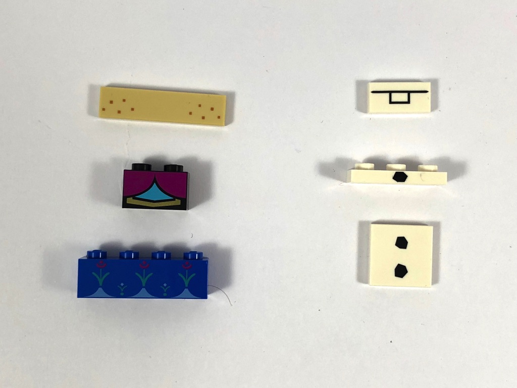 A l’intérieur, nous trouvons 3 sachets de pièces non numérotés, et une notice d’instructions de 56 pages. L’inventaire n’ayant pas encore été publié par LEGO, difficile de connaître facilement la rareté des différentes pièces. On notera tout de même la présence de 6 pièces tampographiées, soit 3 par personnage. Et une belle variété de pièces couleur dark orange pour la chevelure d’Anna, et magenta pour sa cape.