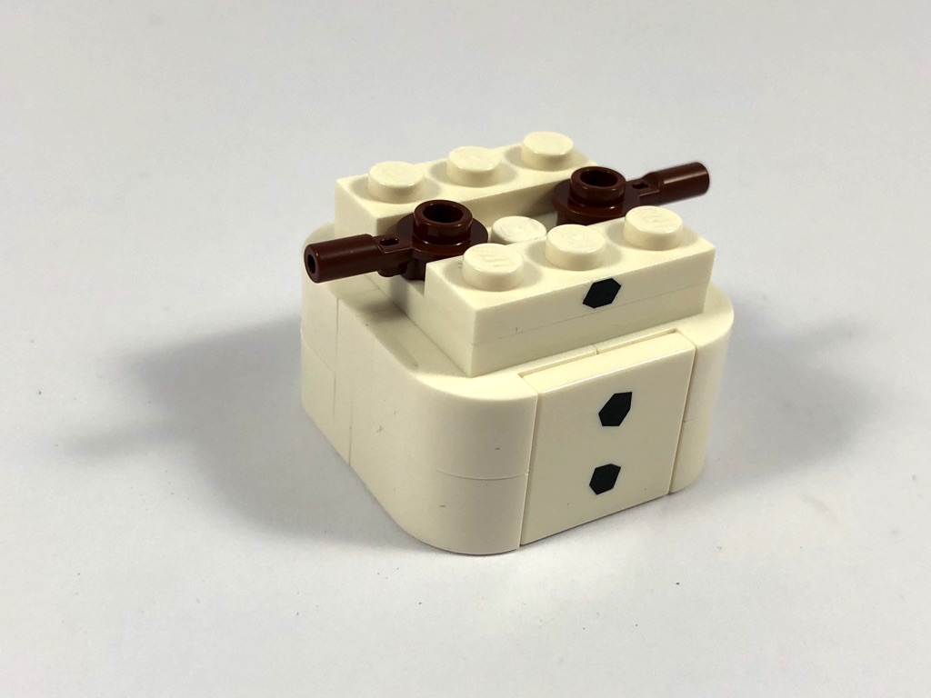Le corps terminé, on lui ajoute deux bras (Bar 1L with 1 x 1 Round Plate with Hollow Stud en reddish brown) puis on construit la structure de la tête, de 3×3 tenons soit un de moins que les BrickHeadz « classique ». Cela impose donc l’utilisation de briques SNOT d’un tenon de large (Brick, Modified 1 x 1 x 1 2/3 with Studs on 1 Side).