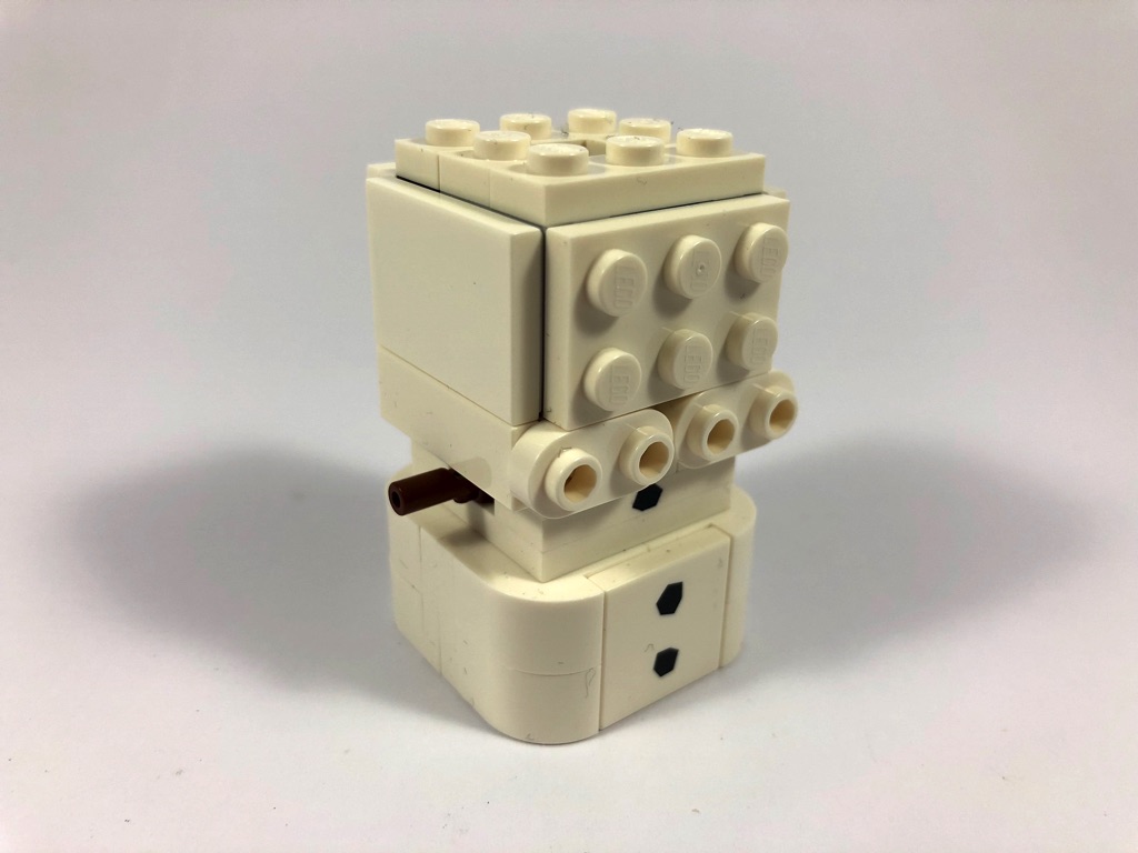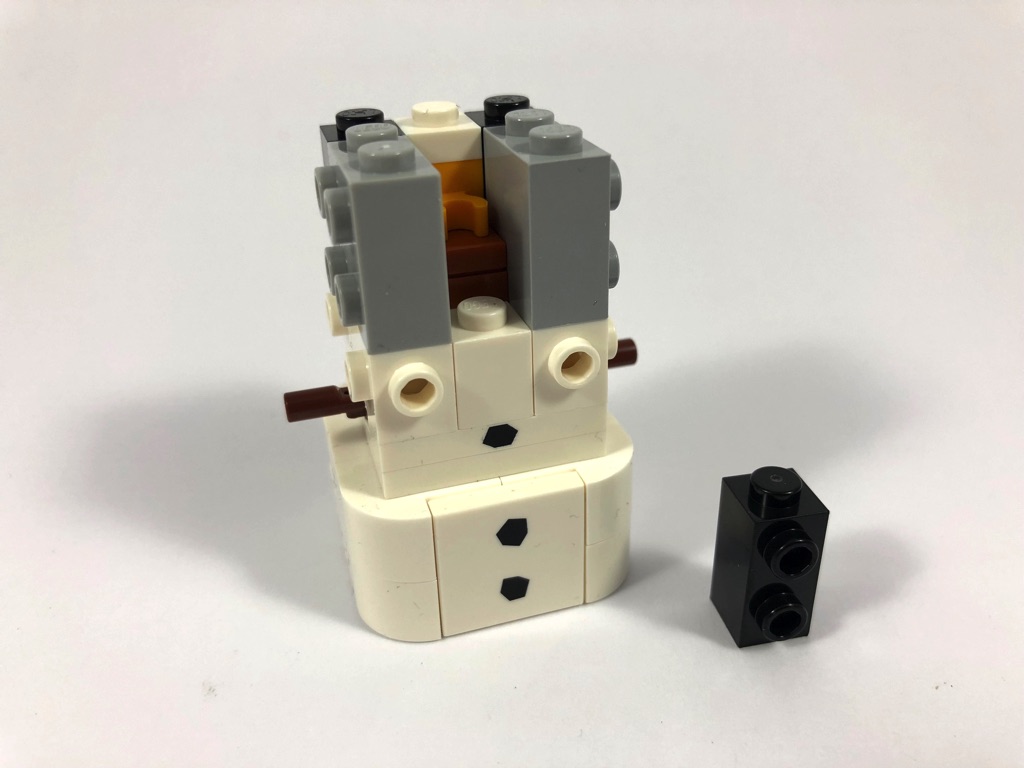 La construction commence par Olaf, dont le corps se compose pour l’essentiel de 8 Brick, Modified 1 x 2 x 1 1/3 with Curved Top, assemblées sur deux brackets. On y ajoute deux tiles 2 x 2 pour « fermer » le tout.