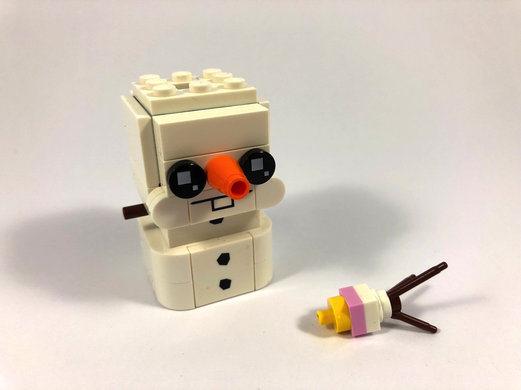 Cette boîte a le mérite d’introduire un peu de variété dans le monde des BrickHeadz, avec la version 3×3 tenons du bonhomme de neige Olaf. Néanmoins, je dois avouer que la construction de celui-ci m’a un peu laissé sur ma faim : un peu trop « basique » à mon goût.