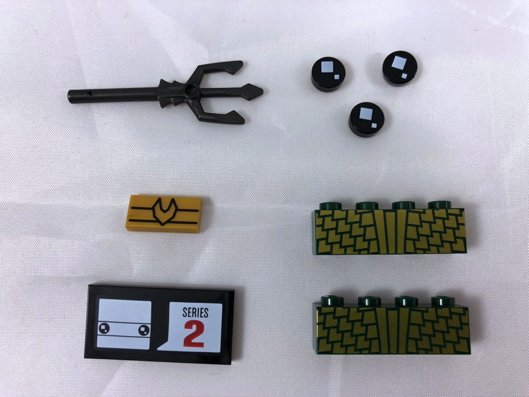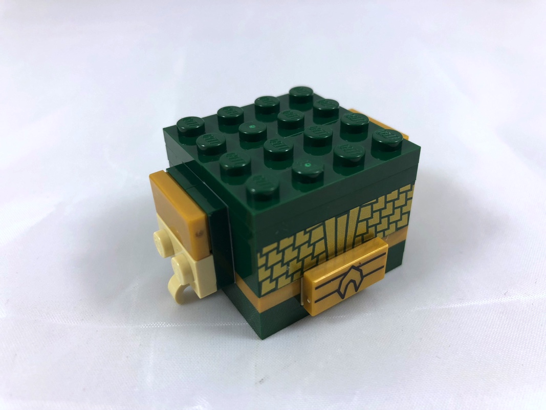 On ne change pas des techniques habituelles pour la construction de notre Aquaman. On commence par assembler le torse, comportant entre autres une ceinture avec sa boucle tampographiée en pearl gold, et le haut du torse en dark green tampographié avec des écailles de poisson dorées (des deux côtés du personnage). Les deux bras sont identiques et réduits à leur plus simple expression : 3 pièces, dont une avec un clip pour former la main.