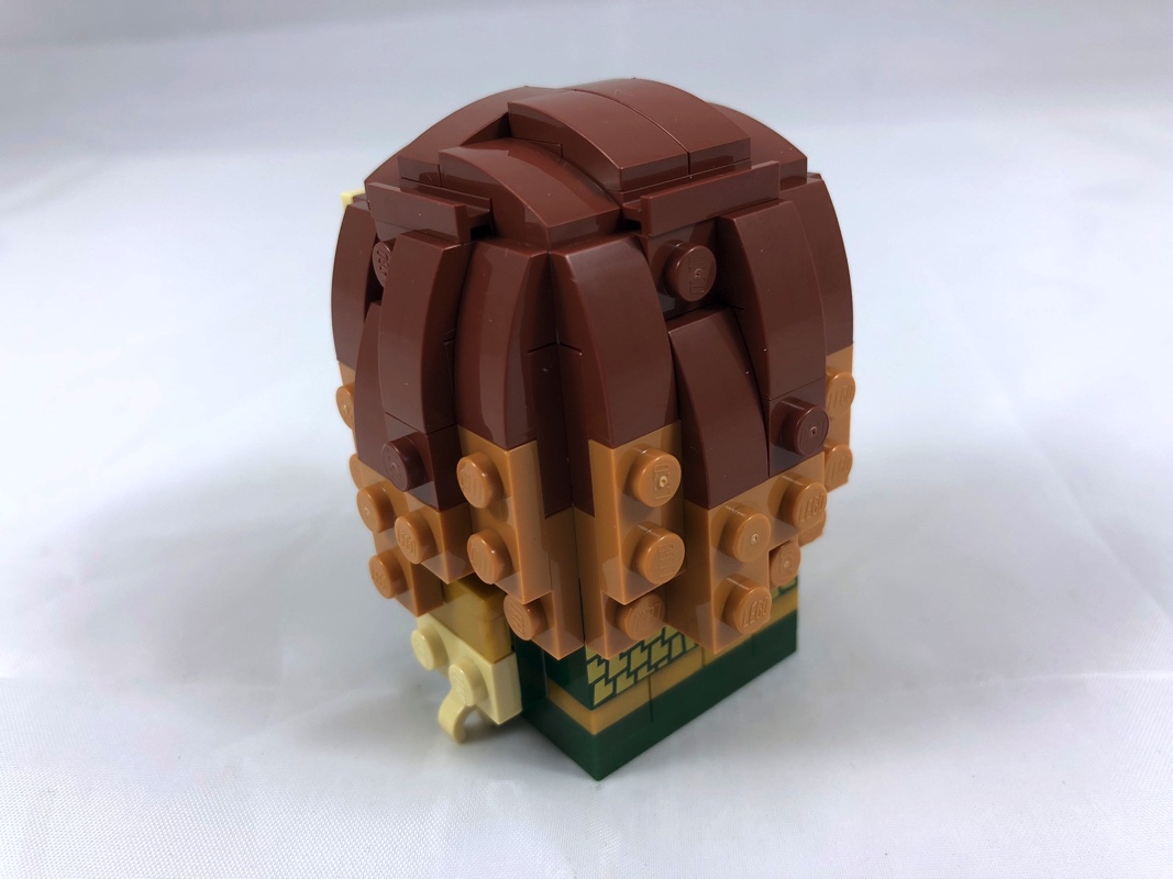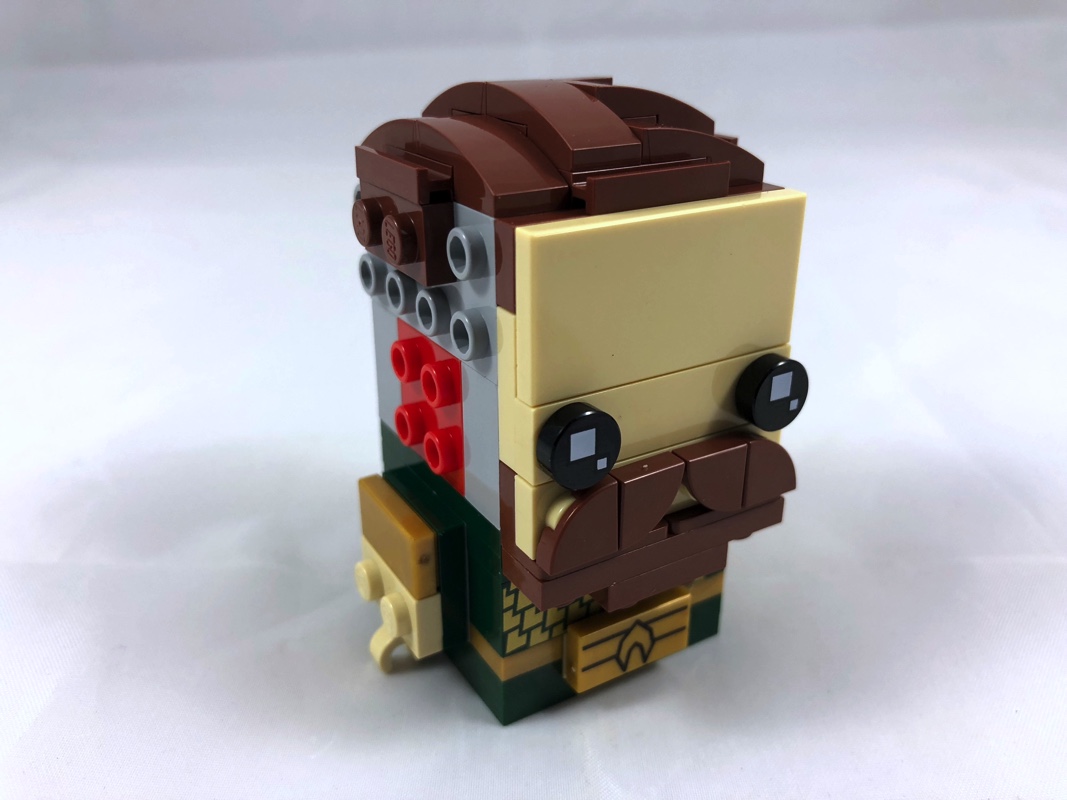 On continue en habillant le haut du crâne de différentes slopes en reddish brown, avant de construire le visage. Point intéressant ici : la construction de la barbe. En effet, elle est réalisée sur 2 bracket inverted et se compose de pièces en tan et reddish brown superposées qui la font également apparaître sur les joues du modèle.