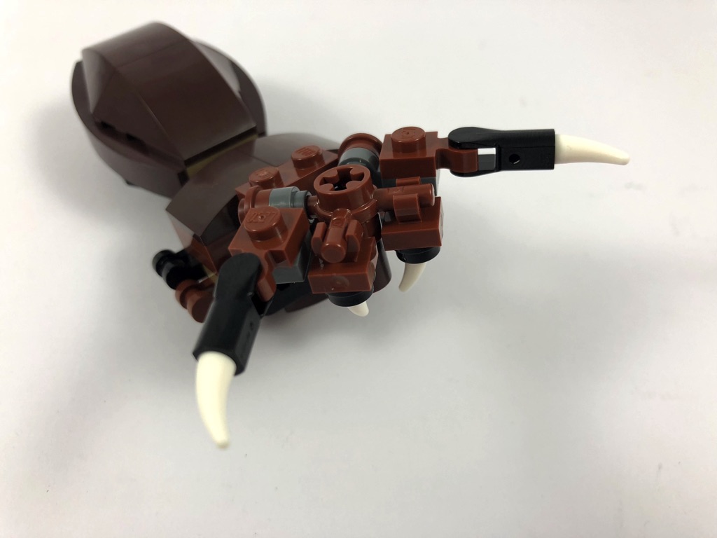 On continue avec Aragog. On commence avec son céphalothorax, sur lequel on retrouve des « poignées » qui permettront par la suite d’y fixer les clips tenant les pattes. Une pièce Technic trouée est posée à l’avant, on y attachera plus tard les mandibules de la bête. On passe ensuite à son abdomen, couvert de deux grandes wedges en dark brown. Il est fixé à la partie précédente grâce à deux charnières, ces éléments sont donc mobiles. Les mandibules sont assemblées après, leur mobilité étant assurée par des clips. On ajoute les yeux, au nombre de 4, fixés sur une même pièce elle-même fixée sur une charnière : ils sont donc également mobiles. Enfin, on termine avec les huit pattes fixées par des clips au niveau du céphalothorax. Elles aussi sont mobiles, suivant deux axes de rotation : entre la fixation et le corps, et entre la patte et la fixation.