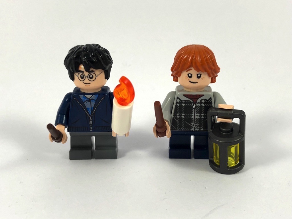 Tous les deux disposent d’une seconde expression du visage, apeurée. Peut-être valait-il mieux ne pas s’aventurer dans la Forêt Interdite ! Les accessoires sont sympathiques également. Outre leurs baguettes magiques, Harry dispose d’une bougie (nouvel élément introduit cette année), et Ron d’une lanterne (un nouvel élément également).