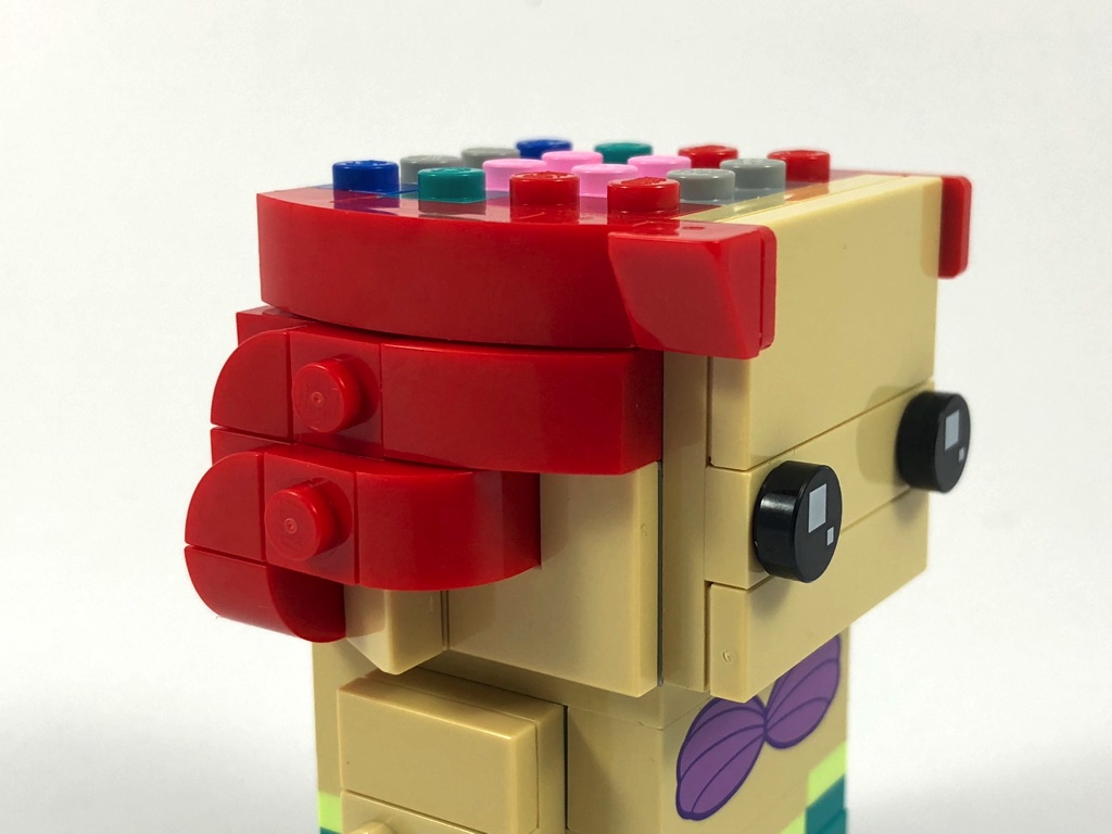 Et pour finir le design est au rendez-vous. Le choix des couleurs est magnifique, et colle bien aux deux personnages. La chevelure très ample d’Ariel est joliment représentée même si on pourra regretter un aspect un peu trop « plat » sur l’arrière et une symétrie pas forcément bienvenue entre les deux côtés. Concernant Ursula, le designer a bien réussi à « capturer » la forme si particulière de sa coiffure, en ajoutant quelques détails intéressants : une mèche grise de chaque côté et des boucles d’oreilles. Petit regret pour les deux personnages : on aperçoit le « dessous » de certaines briques en regardant d’un peu trop près (oui, il fallait bien trouver un petit défaut tout de même !).