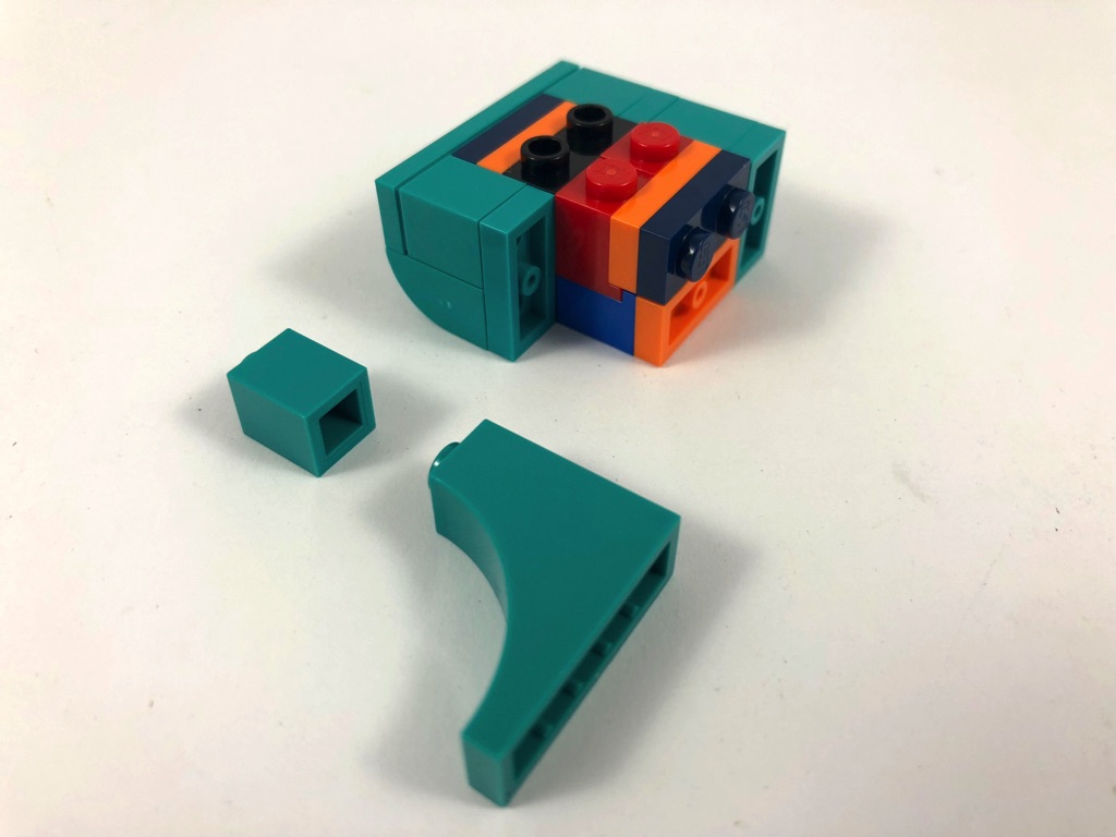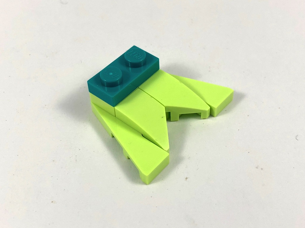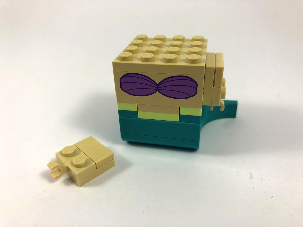La construction démarre par la queue d’Ariel, couleur dark turquoise (aussi appelée teal). La partie courbe située sur l’avant est réalisée avec une seule pièce (Brick, Modified 1 x 4 x 1 1/3 No Studs, Curved Top) posée à plat, et un ingénieux assemblage de briques SNOT (pour Studs Not On Top) permet de fixer cet ensemble sur le futur support, et d’y adjoindre le torse de la sirène. L’amorce de la nageoire est réalisée avec une Brick, Arch 1 x 3 x 2 Inverted.