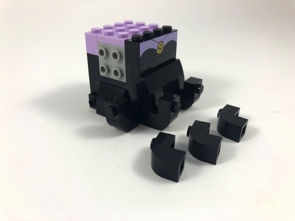 Après la sirène, la pieuvre. La sorcière du dessin animé est en effet dotée de 6 tentacules. Nous démarrons ici aussi par la partie inférieure du corps. Des brackets sont disposés tout autour afin de recevoir les fameuses tentacules. Le reste du torse et les bras sont également « standards ». Après la queue d’Ariel en dark turquoise, on notera ici la présence d’une autre couleur plutôt rare dans la réalisation du torse d’Ursula : lavender.