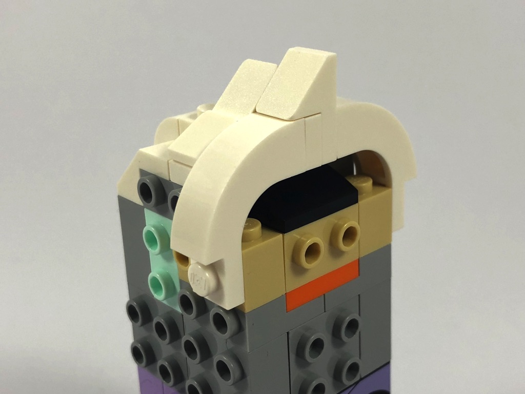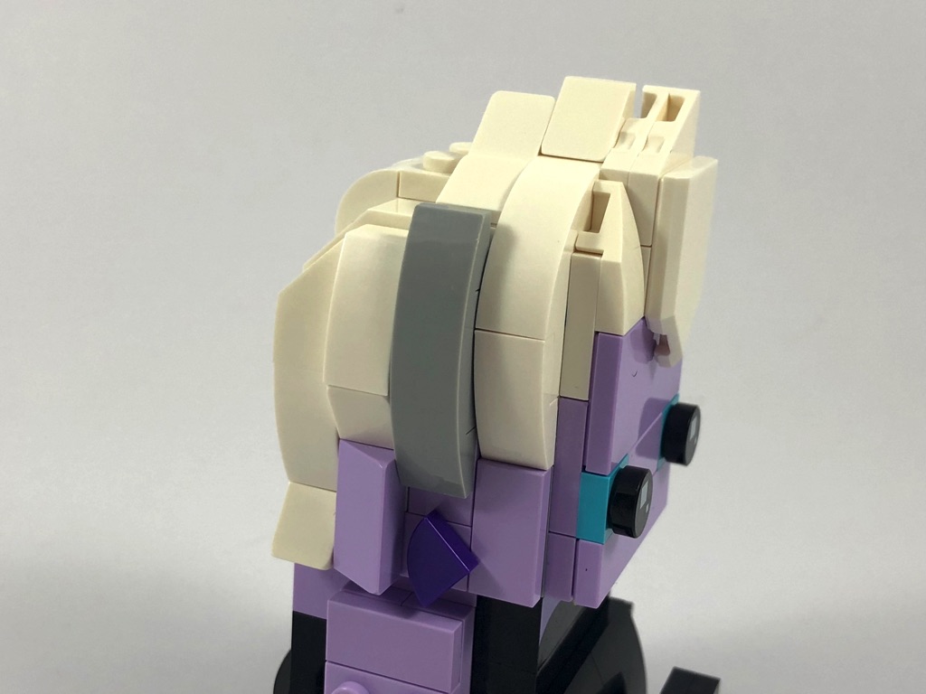 Les deux côtés du visage sont symétriques, on notera la présence d’une mèche grise de chaque côté, ainsi que de deux boucles d’oreilles couleur dark purple. On termine la tête avec la partie arrière, assemblage de slopes de différentes tailles plutôt réussi. Il ne reste qu’à construire le socle d’exposition, lui aussi spécialement adapté pour l’occasion.