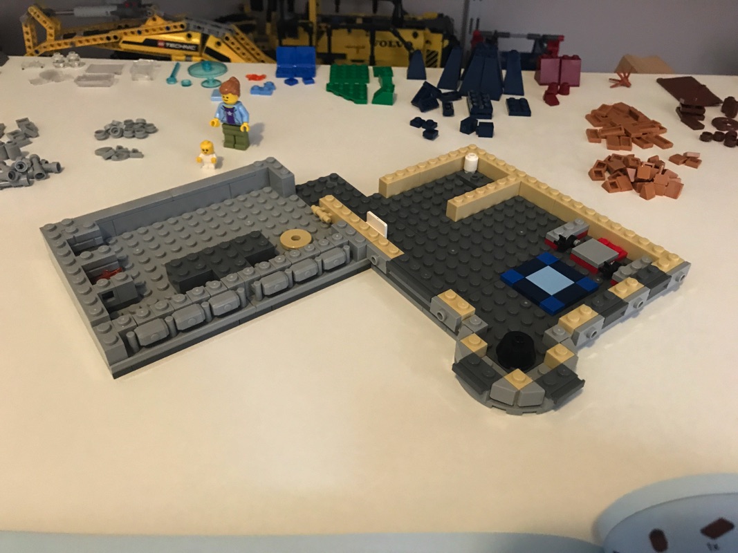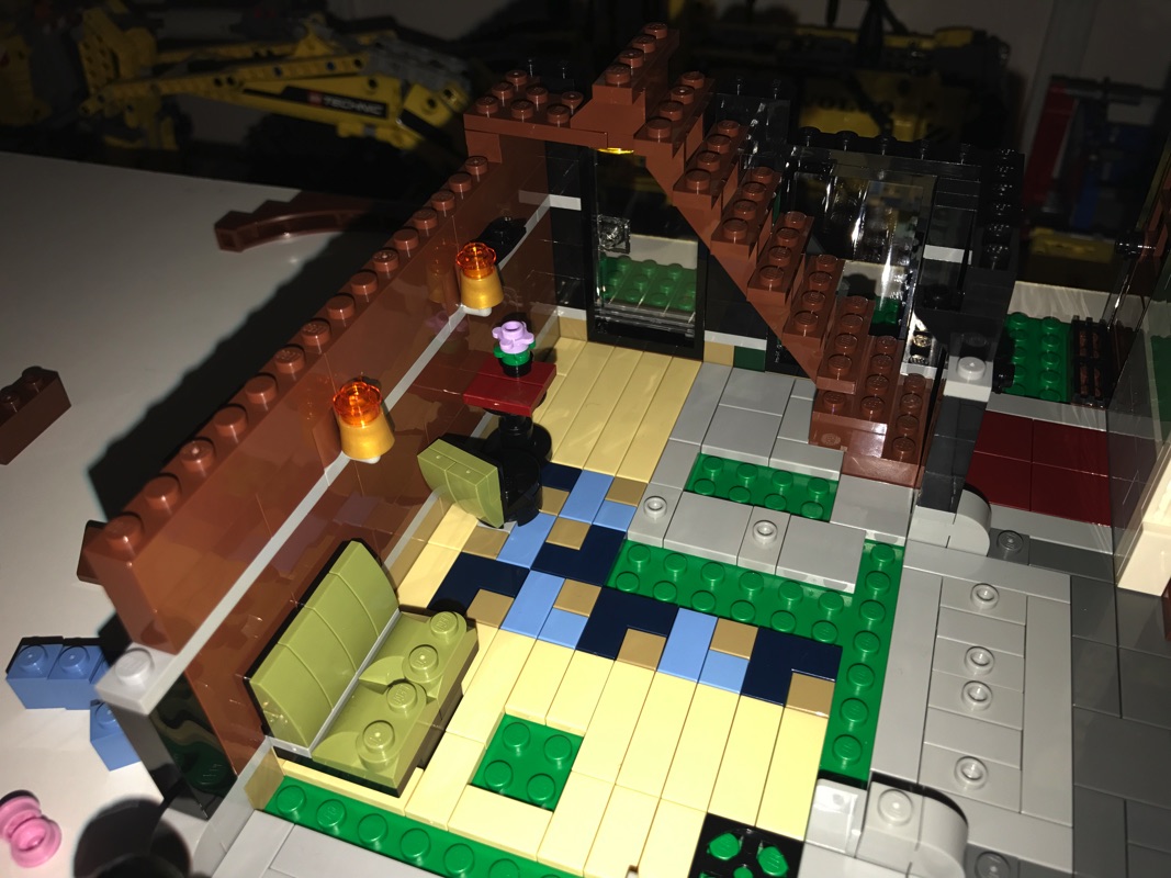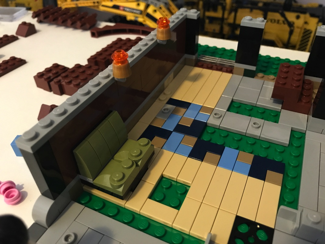 L’autre partie de ce niveau est composé d’une terrasse semi-couverte, avec un barbecue et une couverture réalisée à l’aide de godets de pelleteuse Technic. On y retrouve également une table et quelques accessoires.