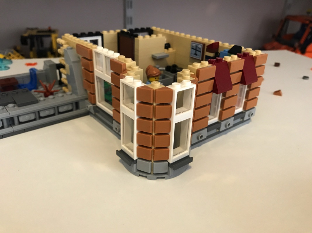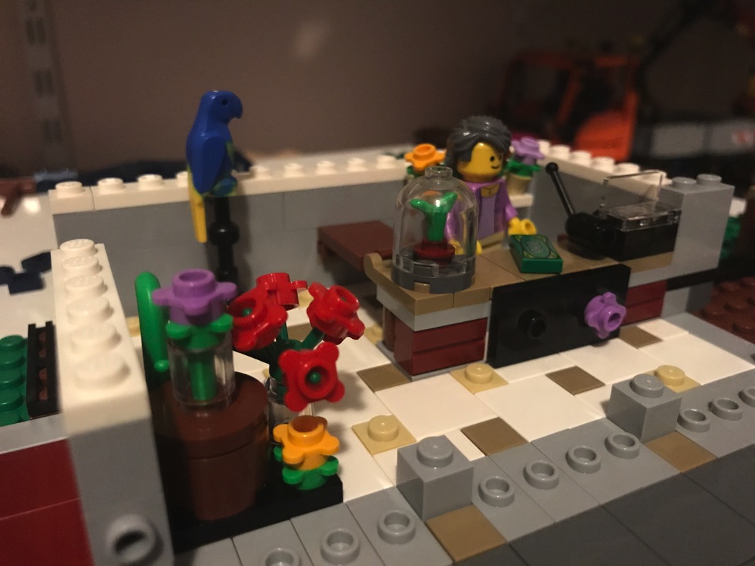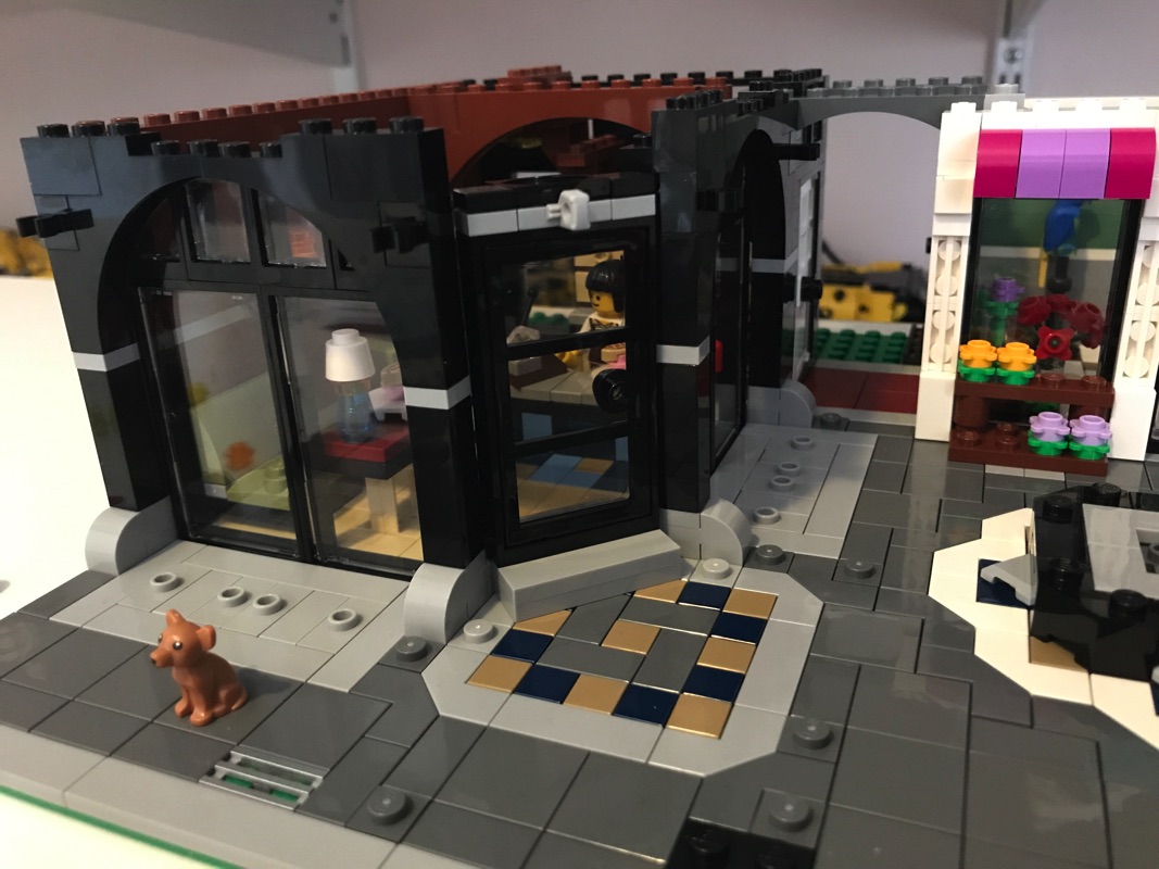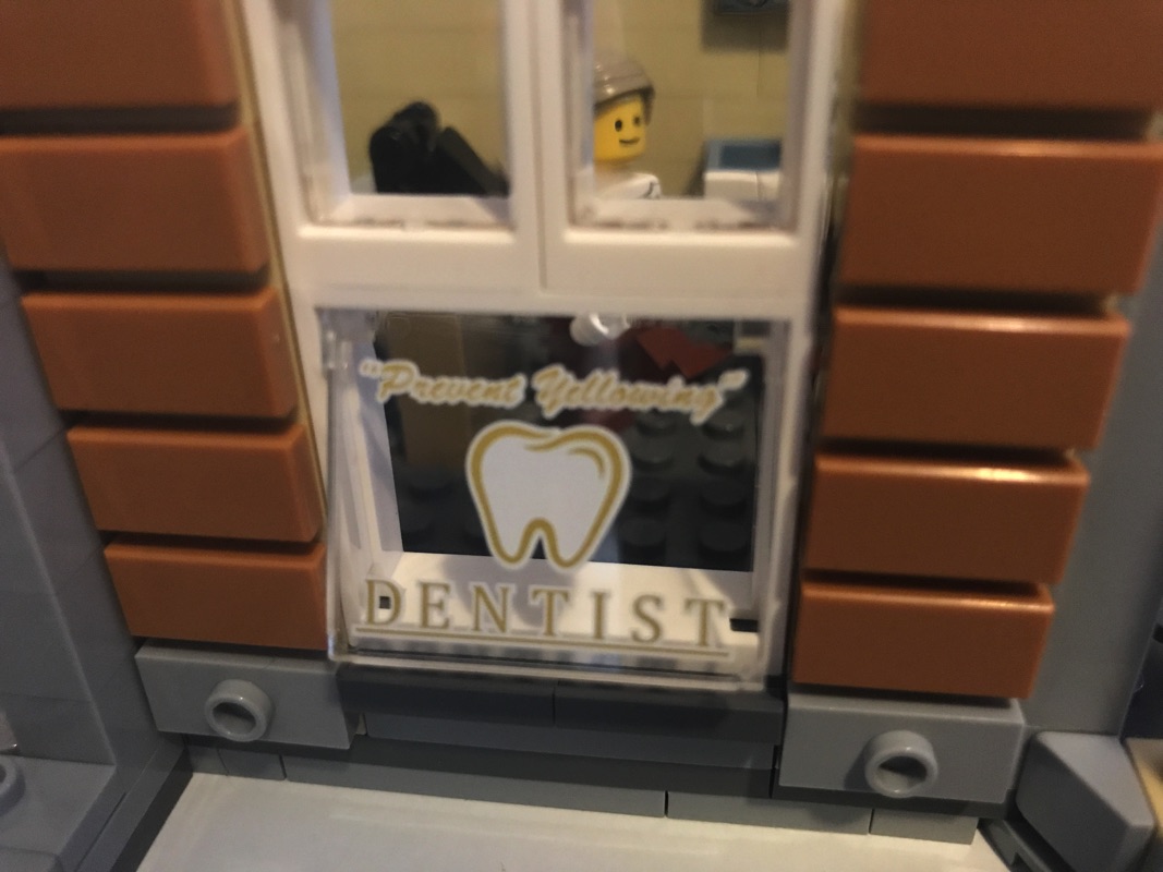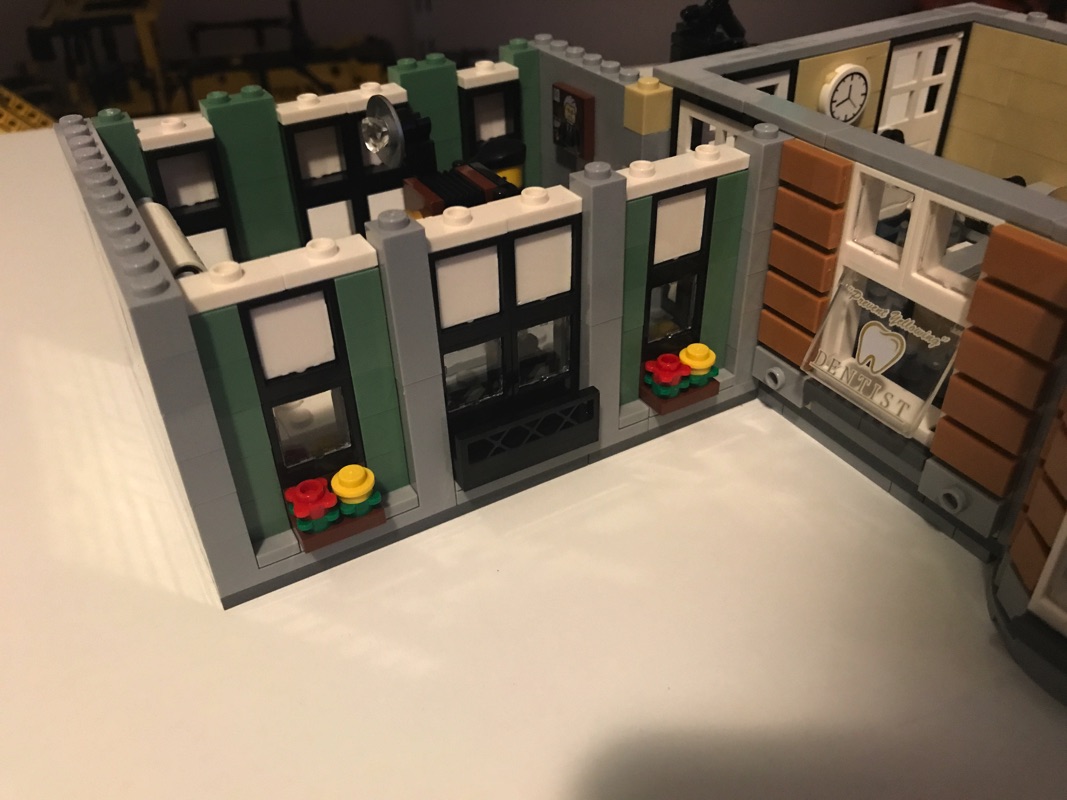 On commence par assembler une plaque de base aux dimensions correspondant au fleuriste et au pâtissier réunis, qui vont donc accueillir le cabinet du dentiste et le studio du photographe. C’est par ce dernier que commence l’aménagement de l’intérieur, avec encore une fois des détails à n’en plus finir. La pièce maîtresse est sans doute le fauteuil du dentiste avec son équipement et son éclairage, mais on retrouve également le comptoir, le présentoir avec les journaux, le lavabo, le meuble de rangement ou encore une plante. Un escalier extérieur mène vers le niveau supérieur. L’extérieur n’est pas en reste, à base de tiles 1×2 en medium dark flesh sur un fond couleur sable. Détail croustillant, une des vitres donnant sur l’extérieur porte la mention « Dentist », mais également « Prevent Yellowing », problème récurrent chez les fans de Lego 😉