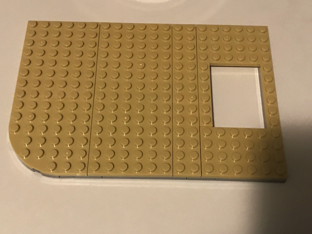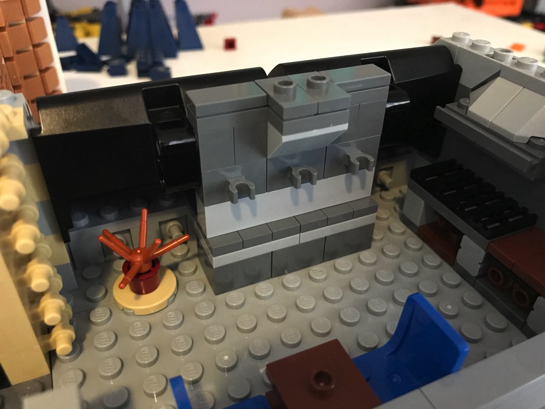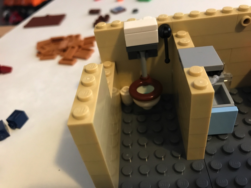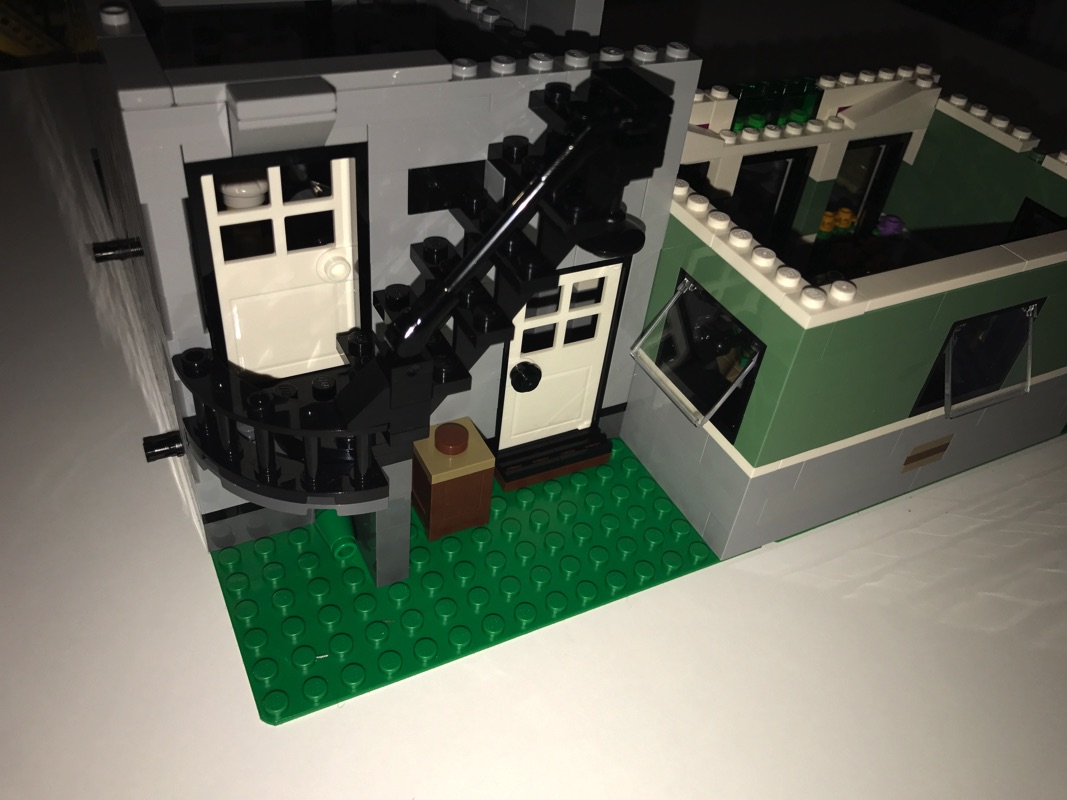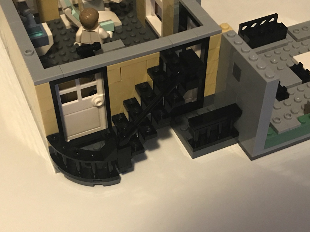 On commence par assembler une plaque de base aux dimensions correspondant au fleuriste et au pâtissier réunis, qui vont donc accueillir le cabinet du dentiste et le studio du photographe. C’est par ce dernier que commence l’aménagement de l’intérieur, avec encore une fois des détails à n’en plus finir. La pièce maîtresse est sans doute le fauteuil du dentiste avec son équipement et son éclairage, mais on retrouve également le comptoir, le présentoir avec les journaux, le lavabo, le meuble de rangement ou encore une plante. Un escalier extérieur mène vers le niveau supérieur. L’extérieur n’est pas en reste, à base de tiles 1×2 en medium dark flesh sur un fond couleur sable. Détail croustillant, une des vitres donnant sur l’extérieur porte la mention « Dentist », mais également « Prevent Yellowing », problème récurrent chez les fans de Lego 😉