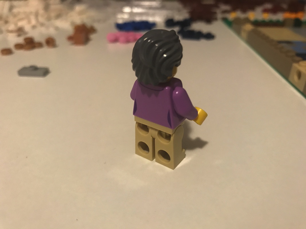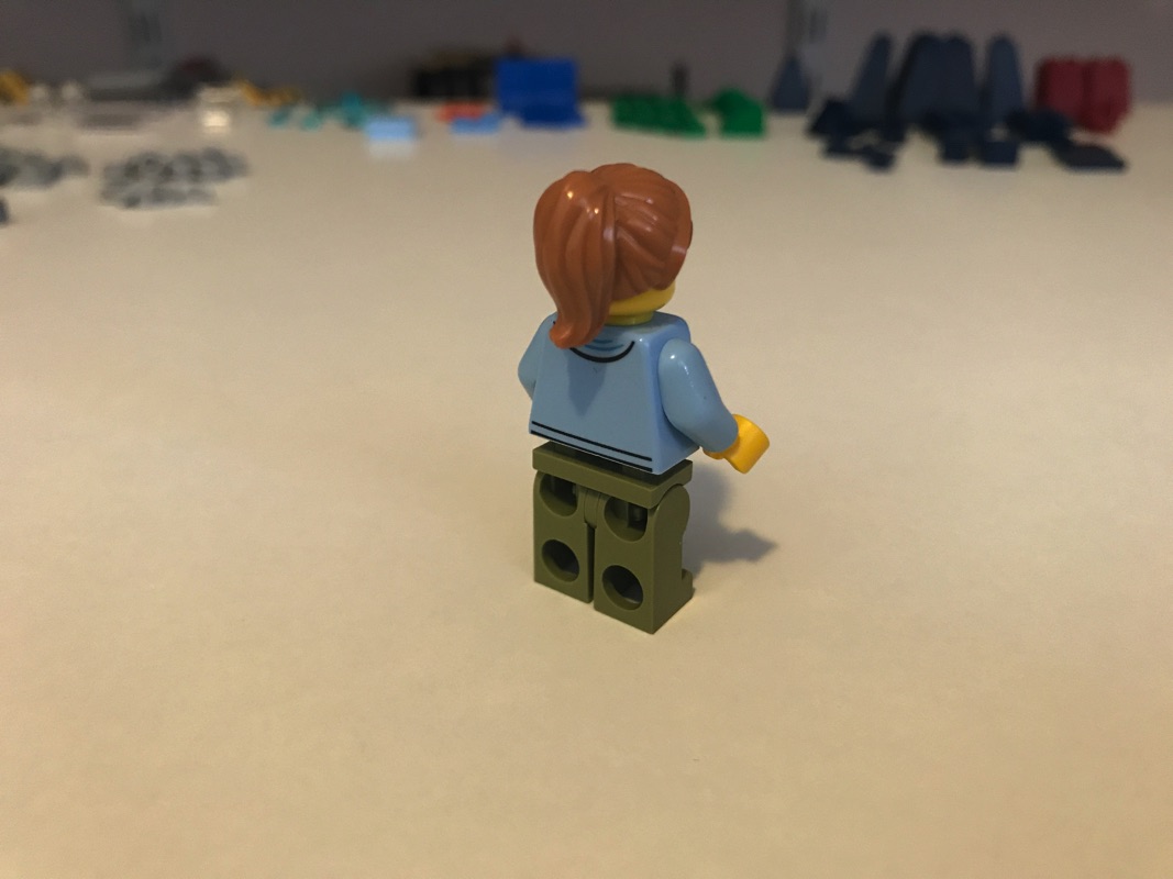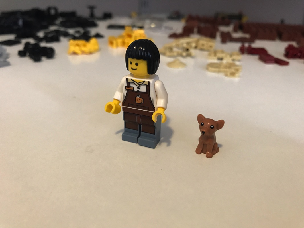 La troisième étape démarre également par l’assemblage d’une minifigurine, correspondant cette fois à l’employée du café que nous allons assembler. Encore une fois plutôt basique, on note cependant la tampographie des jambes au contraire des deux précédentes. On trouve également un chien, qui prendra plus tard place sur une des chaises du café 😉