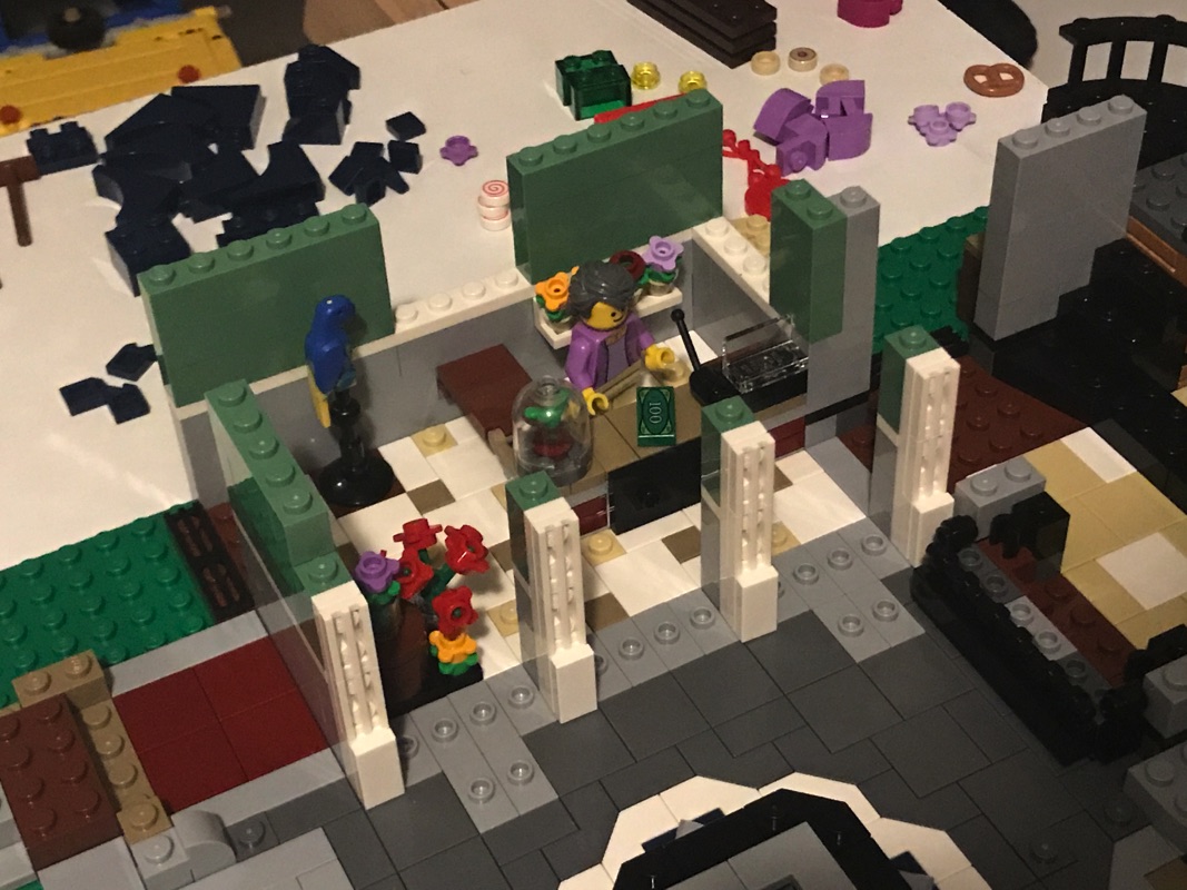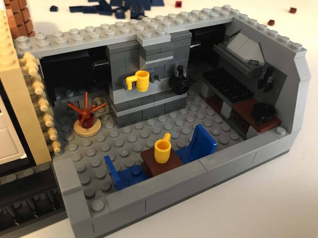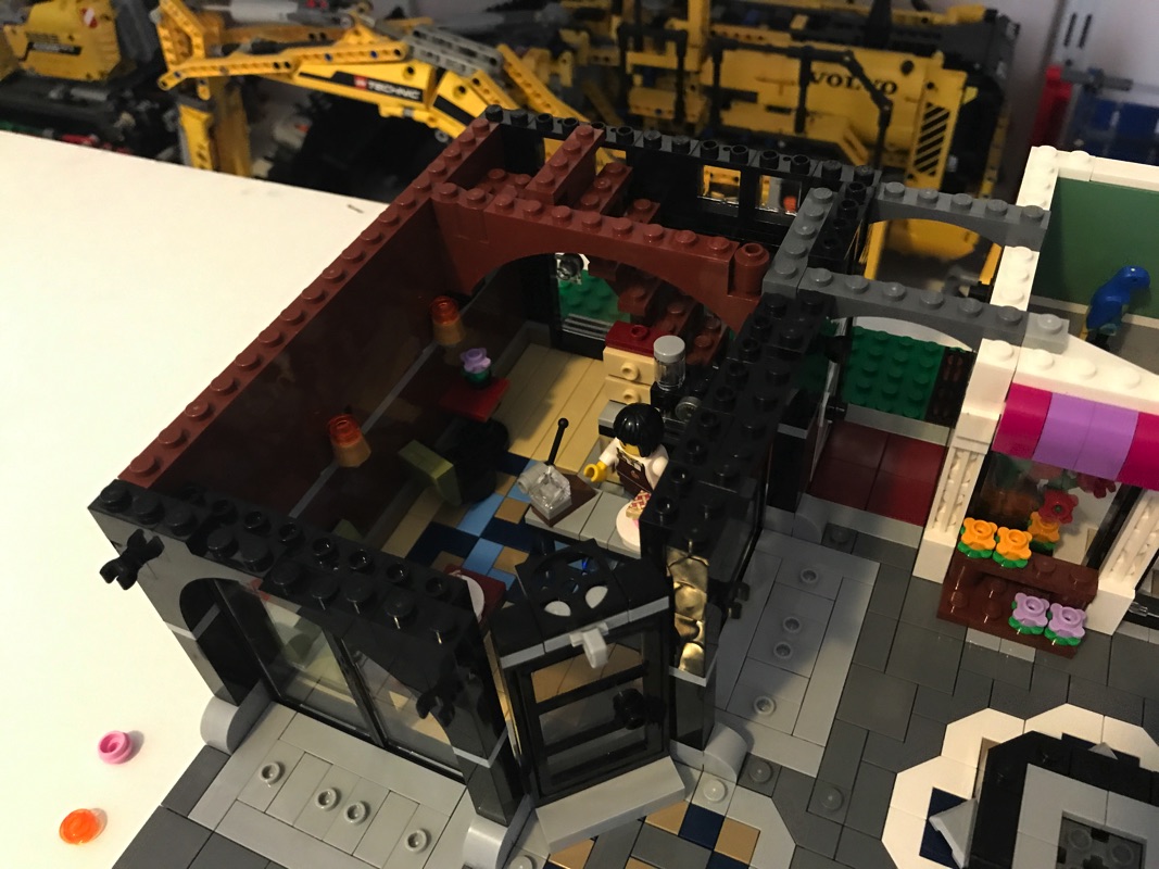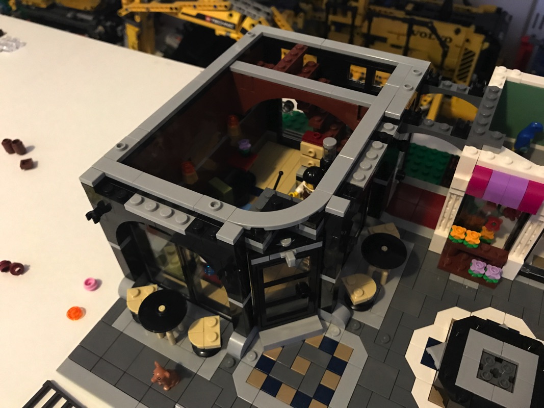 Nous assemblons donc ici la dernière partie du rez-de-chaussée, le troisième bâtiment : le café. Encore une fois, il regorge de détails : le canapé vert olive, la table avec le café et les mets, le comptoir coloré, la caisse enregistreuse, la machine à café, les meubles divers et variés… C’est vraiment un régal à construire, avec des petits détails dans tous les coins.