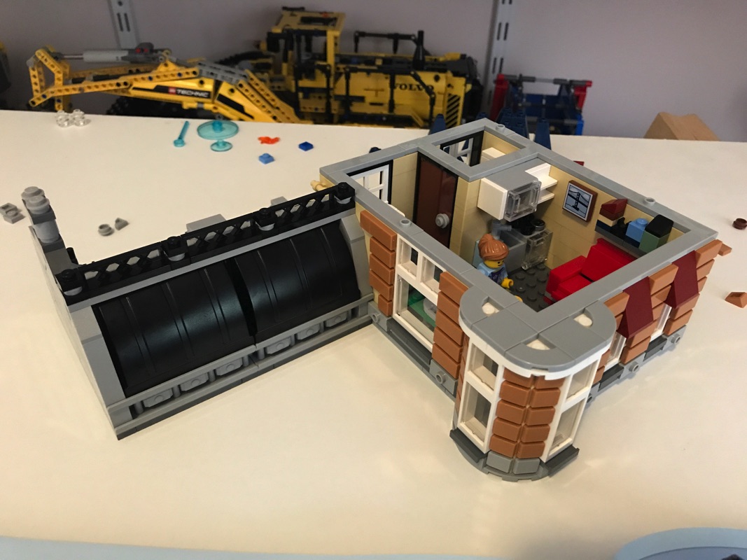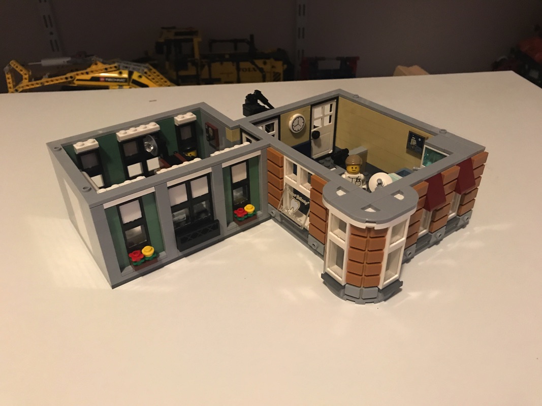 Vient donc ensuite l’assemblage du deuxième étage, cette fois au dessus de la partie dentiste – photographe. On construit tout d’abord un appartement ou l’on retrouve notamment une tile tampographiée avec la boîte du Cafe Corner pour célébrer convenablement les 10 ans de la série.