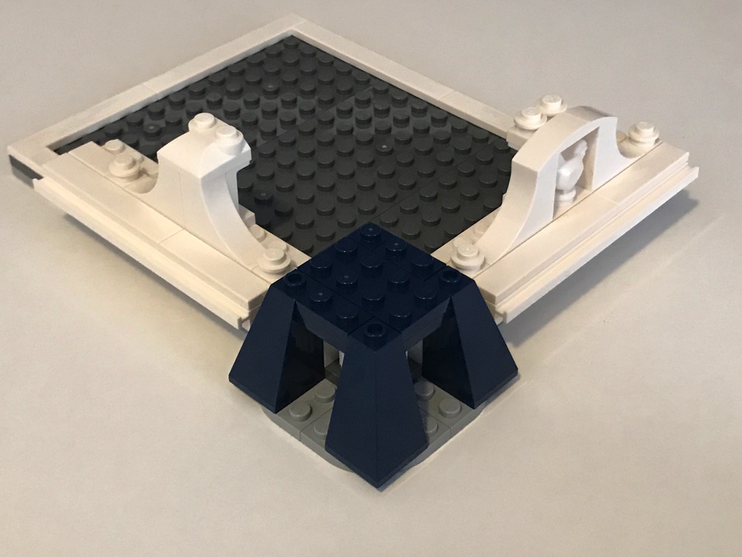 Après avoir assemblé ce dernier étage, on vient fignoler la place en elle-même, par la complétion de la fontaine à base de pièces en trans light blue et l’ajout de deux réverbères identiques à ceux que l’on peut trouver dans les autres sets de la gamme modular.