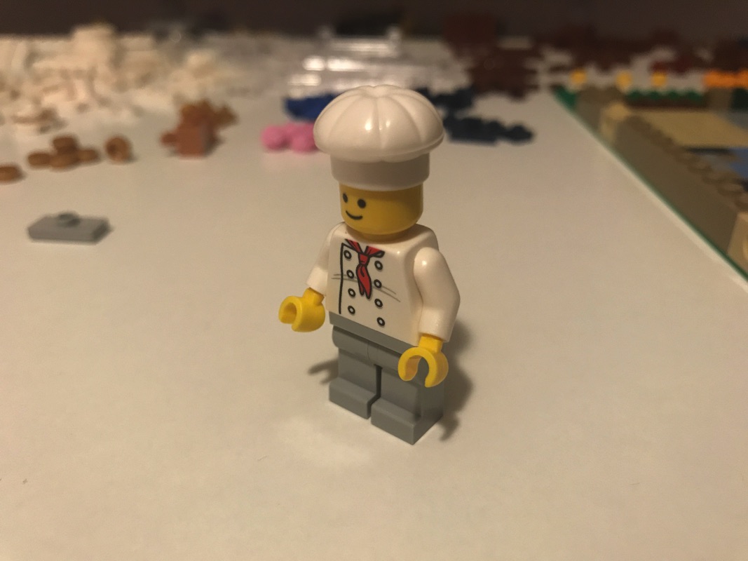Après cette première étape d’assemblage du « sol », il faut avouer un peu rébarbative, nous entrons dans le vif du sujet avec l’assemblage de la série de sachets numérotée 2, qui correspond à la pâtisserie et au fleuriste situés au rez-de-chaussée. On commence d’ailleurs par les 2 minifigurines du pâtissier et de la fleuriste. Visage de base, et décors assez simples pour les vêtements, avec un pantalon monochrome. Le pâtissier vient évidemment avec sa toque.