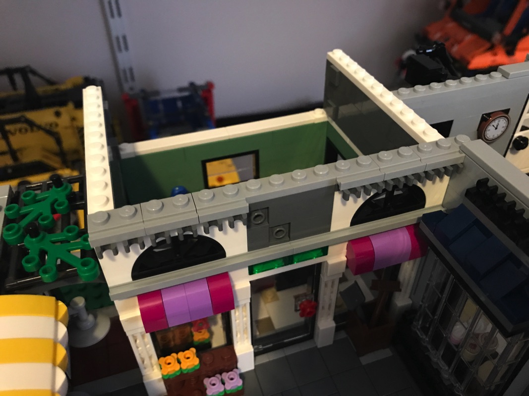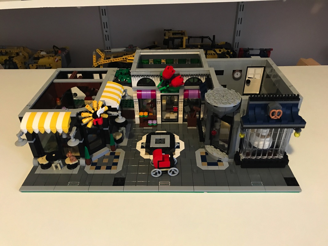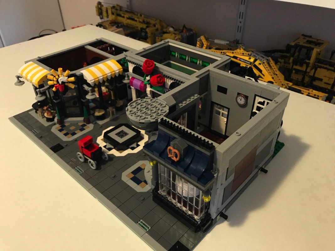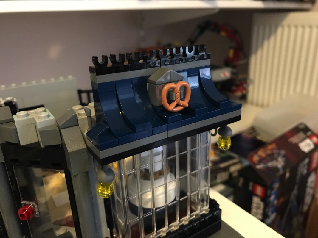On assemble ensuite l’enveloppe extérieure des bâtiments. On notera la vitrine du pâtissier, réalisée à partir d’éléments vitrés assemblés en « chaîne » les uns aux autres qui sont du plus bel effet. la vitrine du fleuriste est quant à elle plus simple, à base de cadres et d’éléments transparents. On construit également le store du pâtissier, à base de dark blue, arborant un bretzel en guise d’enseigne. Un escalier, présent dans la pâtisserie et passant au dessus du four, permet de déboucher sur l’extérieur à mi-hauteur sur un escalier qui mène au niveau supérieur. C’est ainsi que s’achève cette deuxième étape de construction.