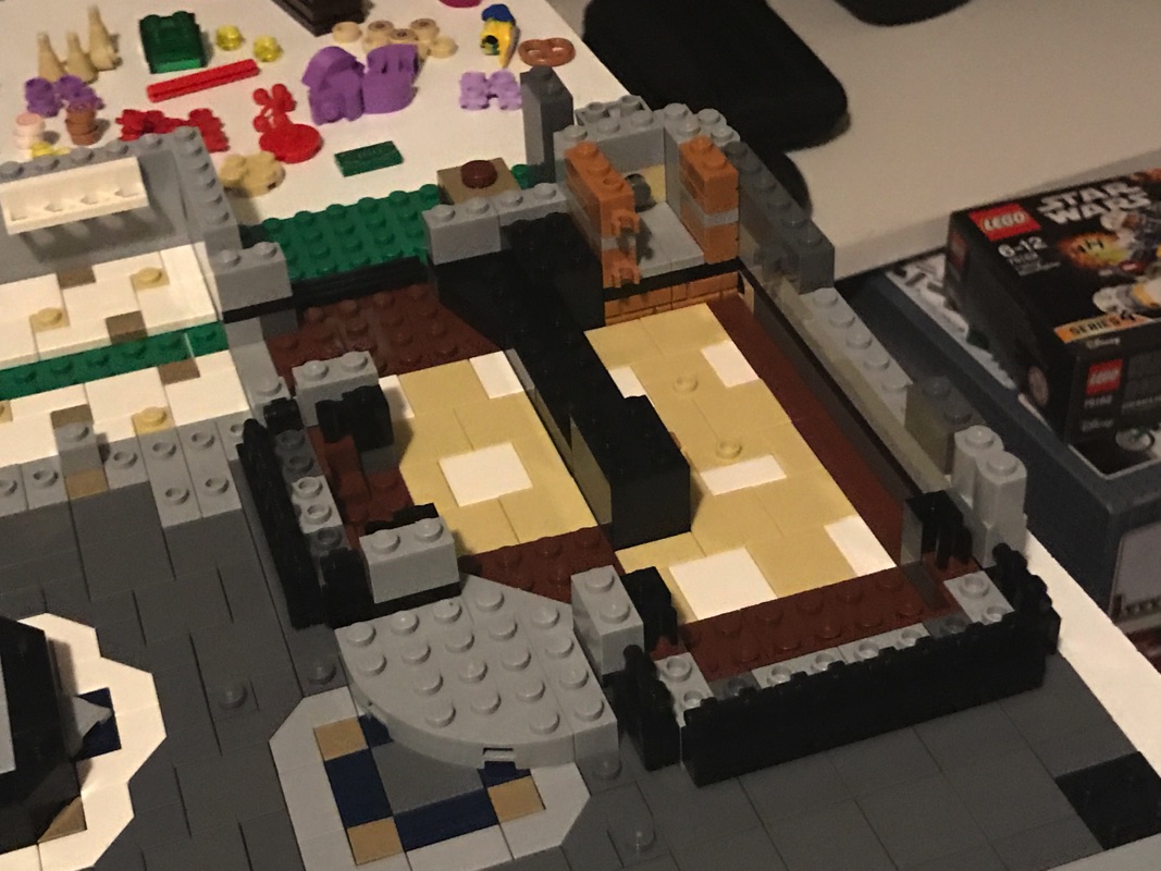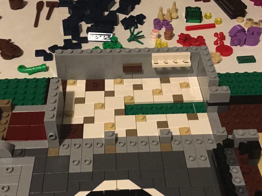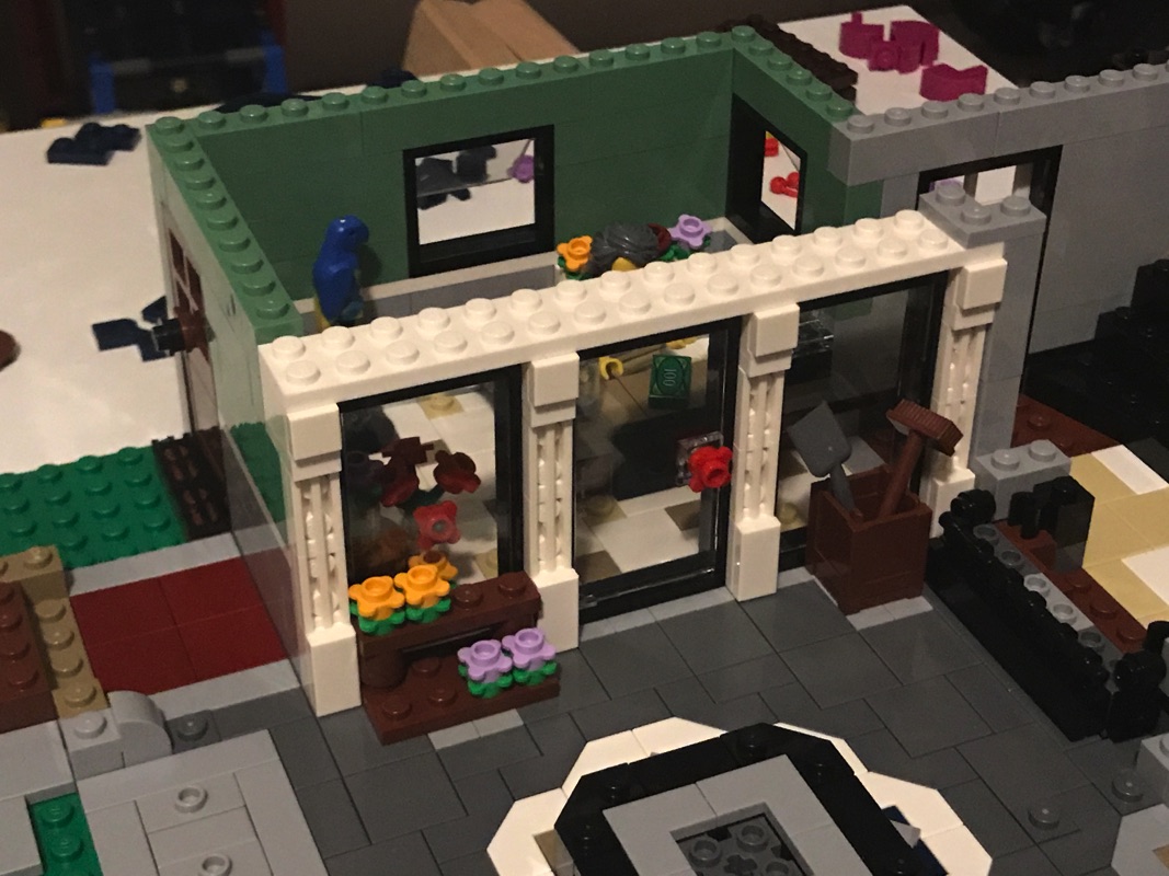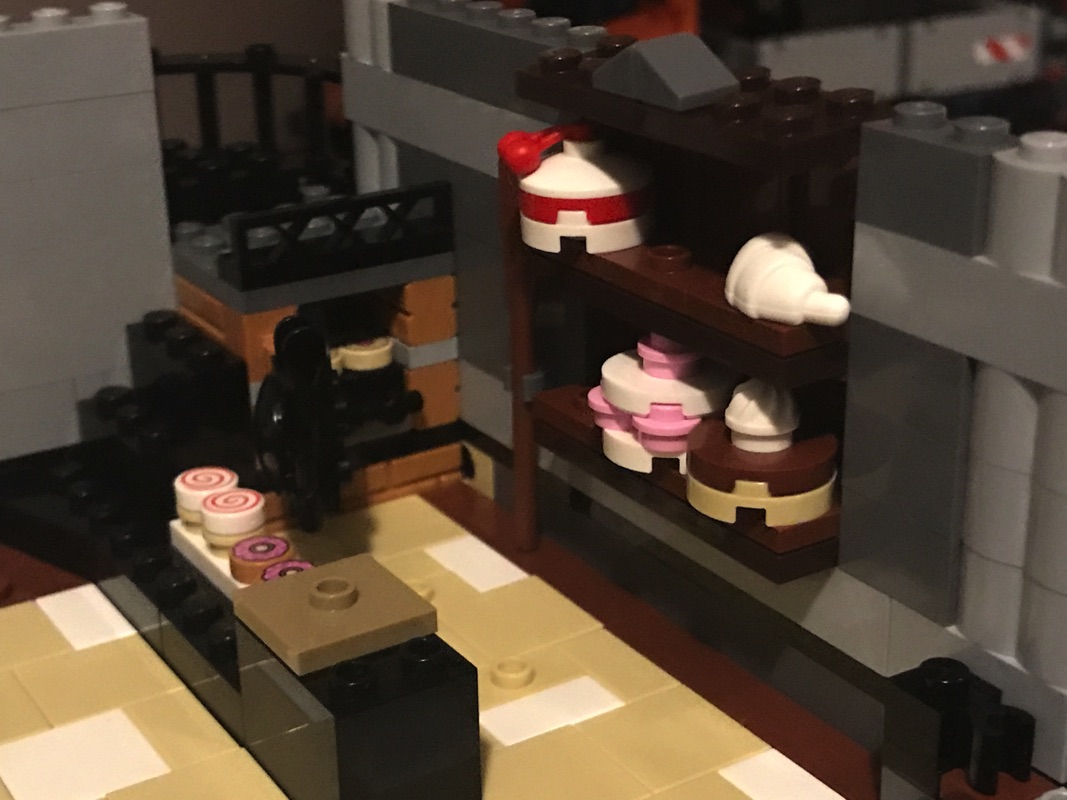 On assemble ensuite l’enveloppe extérieure des bâtiments. On notera la vitrine du pâtissier, réalisée à partir d’éléments vitrés assemblés en « chaîne » les uns aux autres qui sont du plus bel effet. la vitrine du fleuriste est quant à elle plus simple, à base de cadres et d’éléments transparents. On construit également le store du pâtissier, à base de dark blue, arborant un bretzel en guise d’enseigne. Un escalier, présent dans la pâtisserie et passant au dessus du four, permet de déboucher sur l’extérieur à mi-hauteur sur un escalier qui mène au niveau supérieur. C’est ainsi que s’achève cette deuxième étape de construction.
