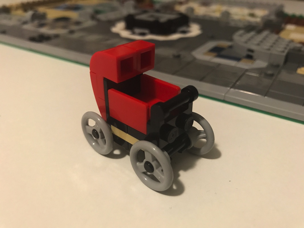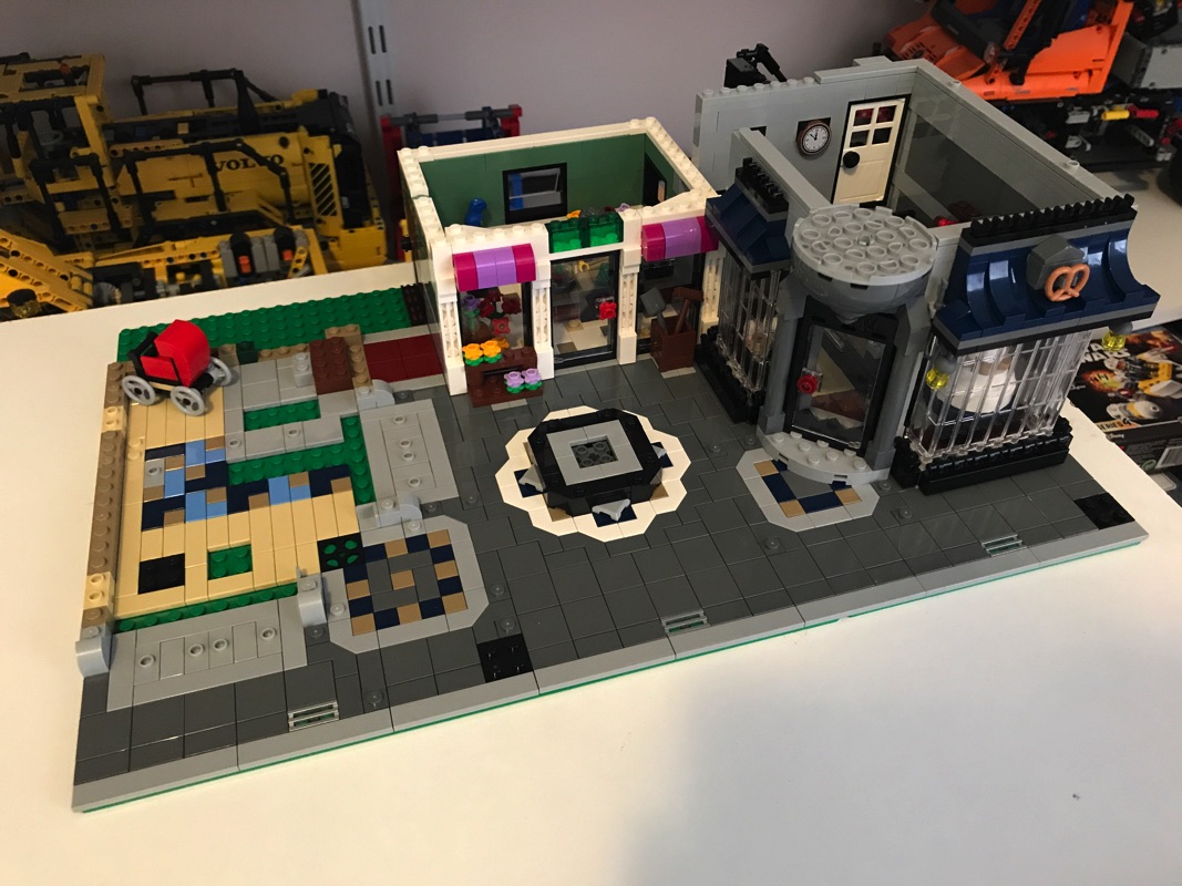 La première série de sachets est dédiée à la réalisation de la plaque de base destinée à recevoir les différents bâtiments. Tout commence par le tri des pièces, et c’est à ce moment que l’on se rend compte de la richesse de l’inventaire du set. On réalise ainsi le sol des futurs fleuriste, café et pâtisserie. On réalise également une partie de la fontaine qui trône au centre de notre place. On a notamment à notre disposition, afin de réaliser le « pavage » des différentes zones, des pièces qui présentent un pan coupé « Tile, Modified 2 x 2 Corner with Cut Corner – Facet« , ces pièces permettent de trancher avec les habituels coins à angle droit que l’on retrouve sur tous les pavages Lego. Ces pièces sont utilisées notamment autour de la fontaine, au centre de la place. On réalise également lors de cette étape une poussette. Seul regret à ce stade, la poussette ne roule pas du fait de sa conception.
