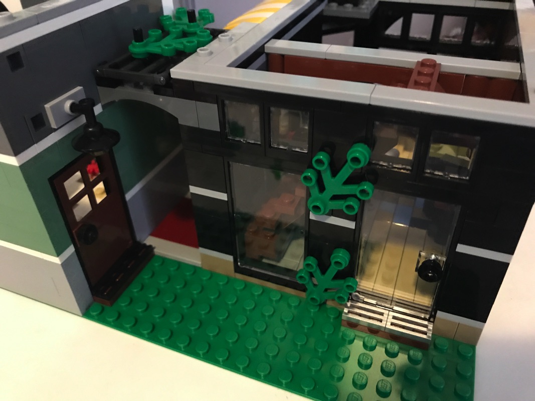On assemble ensuite l’enseigne, vraiment très réussie, représentant une tasse de café fumante, ainsi que la partie haute du fleuriste et son enseigne également, représentant deux fleurs rouges l’une au dessus de l’autre. On construit le store jaune et blanc du café, et les différentes tiles en ligjht bluish gray, qui sont destinées à recevoir les niveaux supérieurs. Un autre élément remarquable, existant également dans l’entrée du pâtissier : la porte est orientée à 45 degrés par rapport au mur, ici grâce à une petite turntable. L’arrière est traité de manière assez « basique », avec quelques fenêtres, portes et un peu d’habillage à base de verdure.