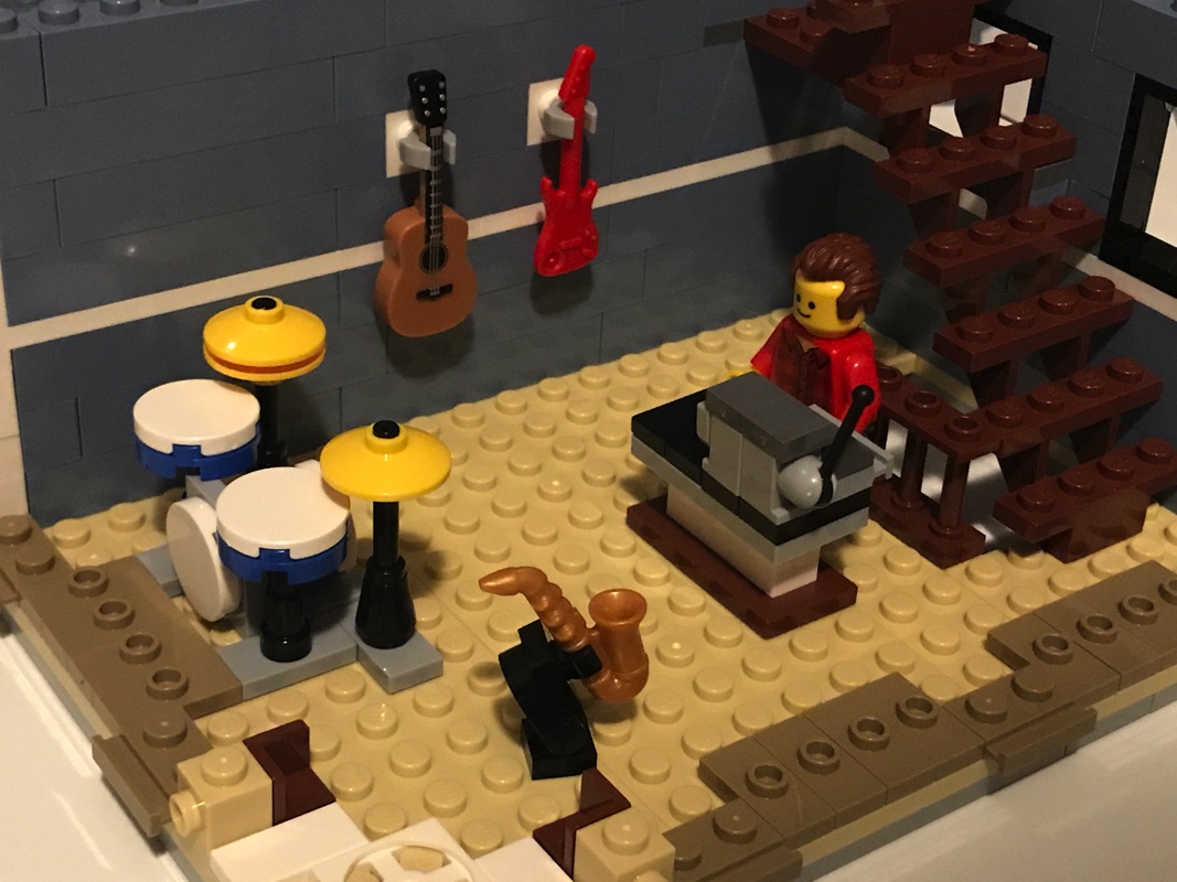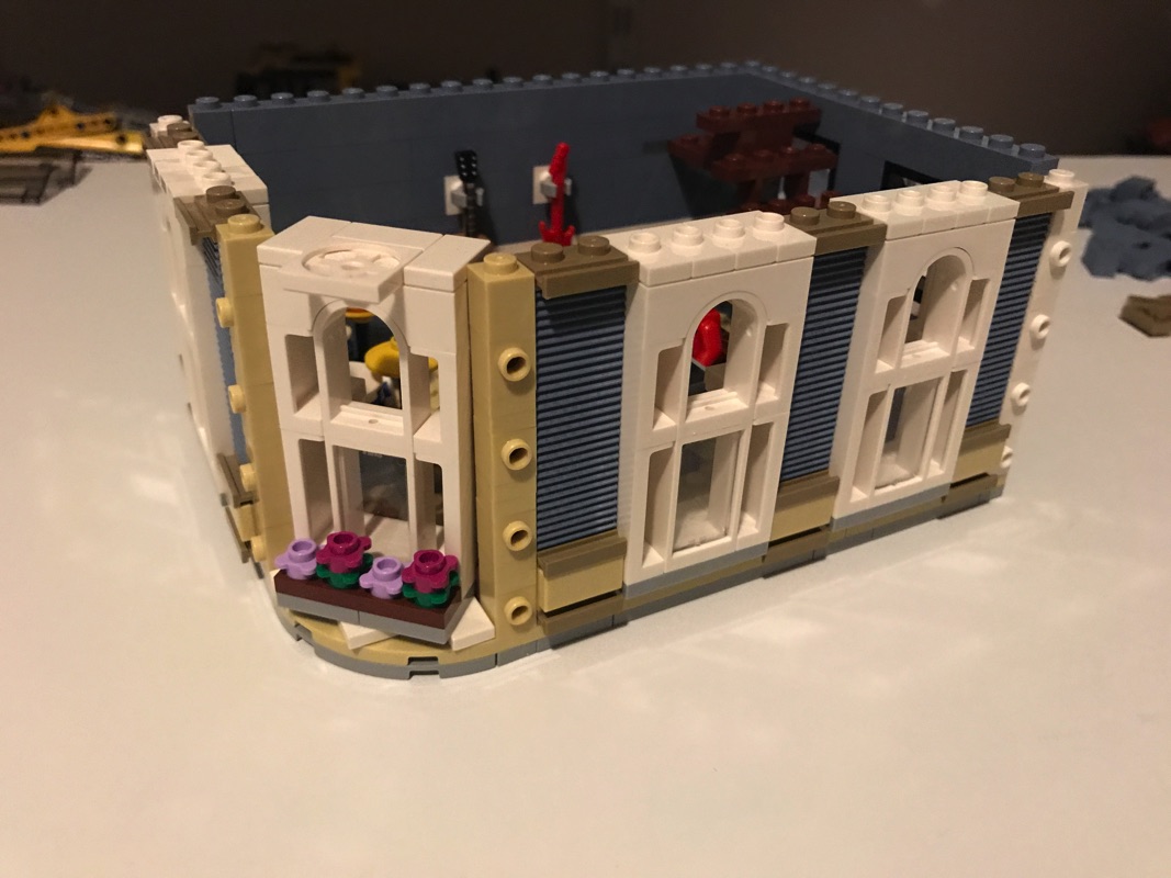 On continue donc avec l’assemblage du niveau qui viendra se situer juste au dessus du magasin de musique. Celui-ci abrite une salle de répétition pour la danseuse, avec sa barre, son miroir et son piano. La base est exactement la même que celle précédemment construite. Détail notable, le miroir est un « vrai » miroir, qui réfléchit ce qui l’entoure, et donc notre danseuse qui vient s’exercer devant ce dernier. On vient assembler à ce niveau un balcon avec une porte donnant sur l’extérieur et un garde-corps. L’intérieur comprend encore une fois un escalier, menant cette fois-ci vers le toit. La façade est en sand blue, avec des stries, apportant un contraste intéressant vis-à-vis des fenêtres blanches et de l’extérieur du studio du photographe en sand green.