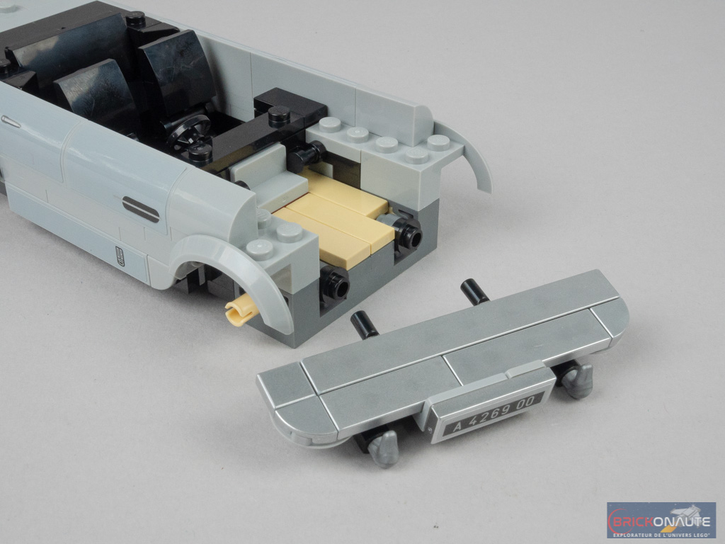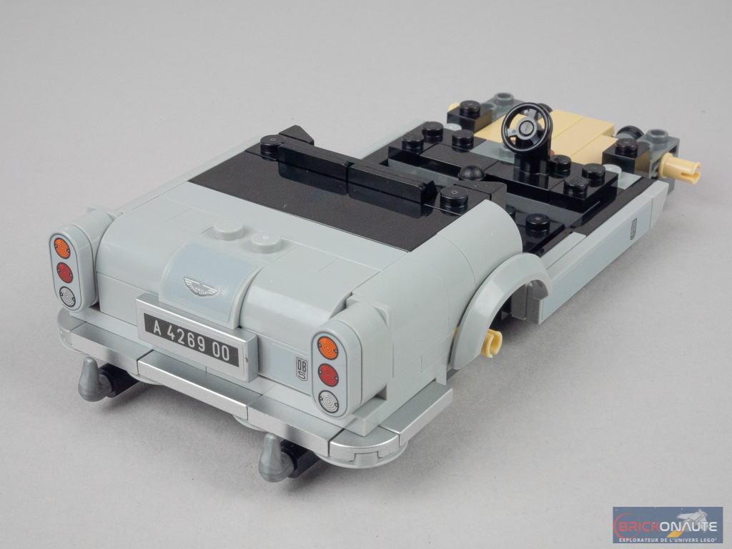 Les photos parlent d’elles-mêmes : je trouve que le design est particulièrement réussi. Côté avant, les quarts de dôme servant pour les phares sont tampographiés, tout comme la calandre et les petites plates servant de clignotants. Seuls la plaque d’immatriculation et le logo Aston Martin sont ici représentés par des autocollants – j’ai beau le dire à LEGO pour chacun de mes tests de la gamme, ils ne semblent pas décidés à systématiquement tampographier ce logo et ce, quelle que soit la marque.