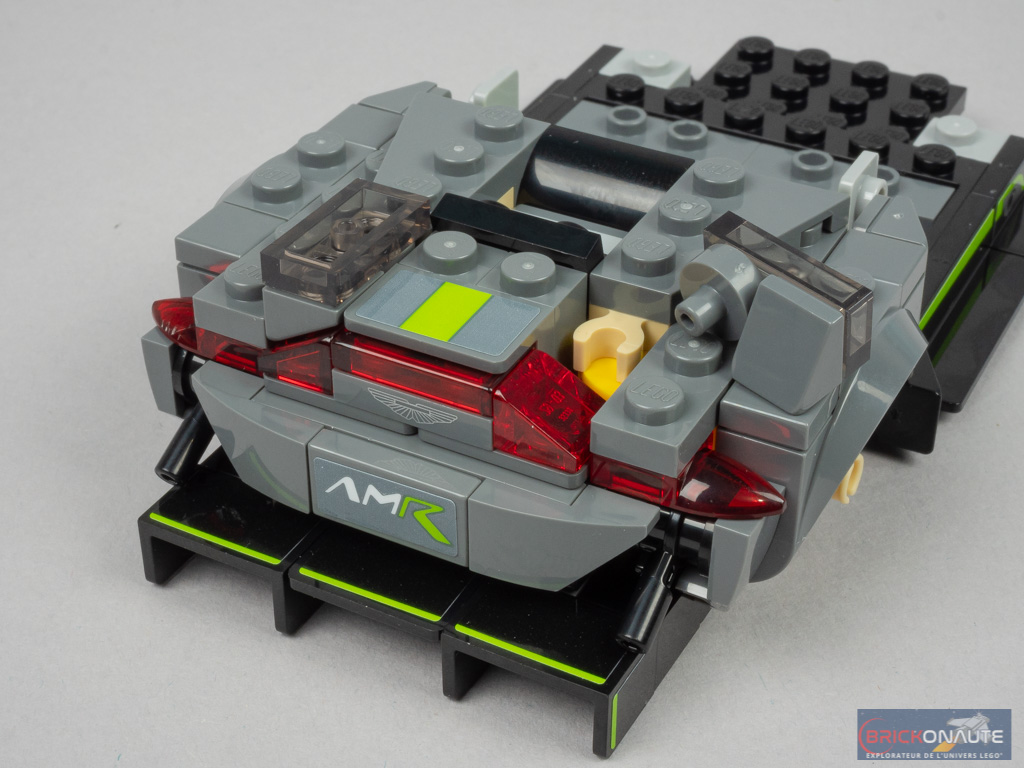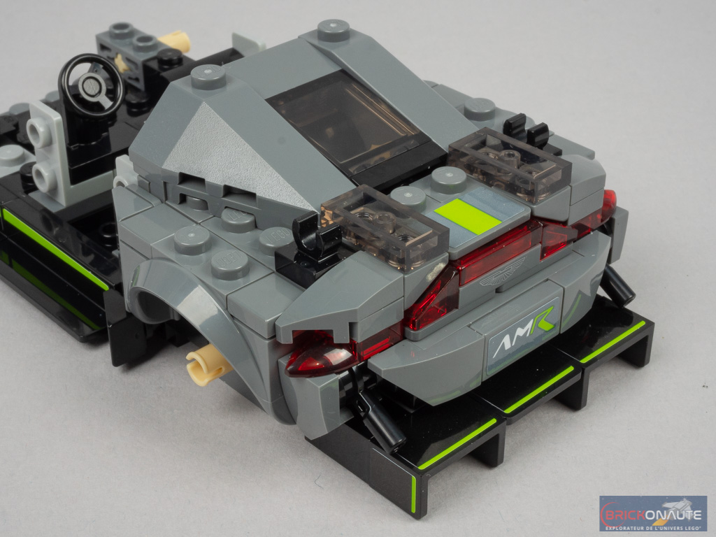 On continue avec les flancs de la voiture, décorés d’autocollants et disposant de petits rétroviseurs verts. On s’intéresse ensuite logiquement à l’avant de la machine. On s’attaque à un sous-ensemble qui, en partie basse, utilise des cornes vertes pour donner à la calandre sa forme caractéristique. Le reste de l’assemblage est alors plutôt simple et consiste en une superposition de plates et tiles variées… et d’autocollants. On utilise les même pièces que pour sa comparse pour la réalisation des phares. On termine avec l’aileron aux couleurs d’Aston Martin Racing, les 4 roues, et la verrière vue et revue dans la gamme tampographiée pour l’occasion.